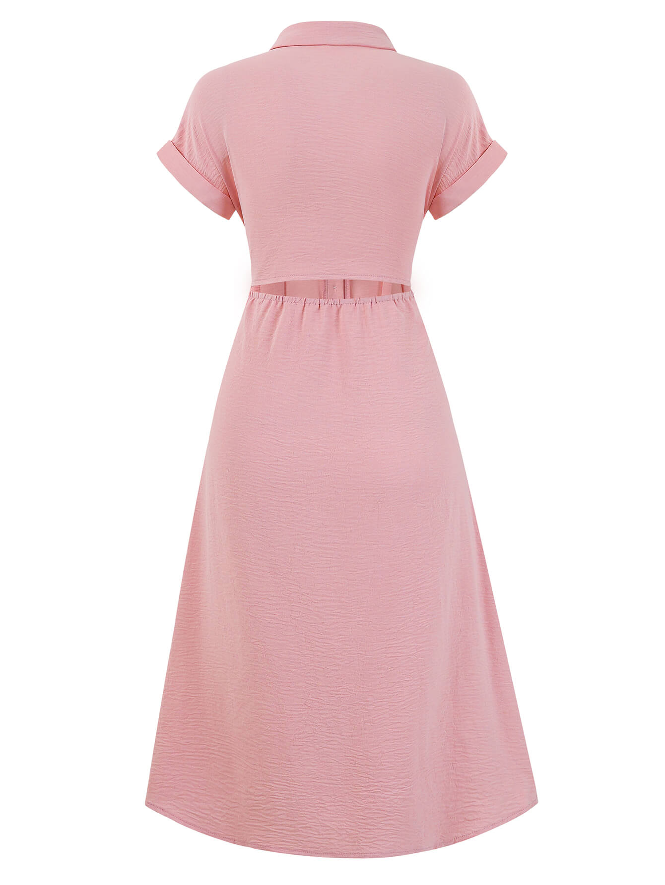 - Feature: Collared. Short Sleeves. Midi length. Front button closures. Cut-Out Back. Not Lined.