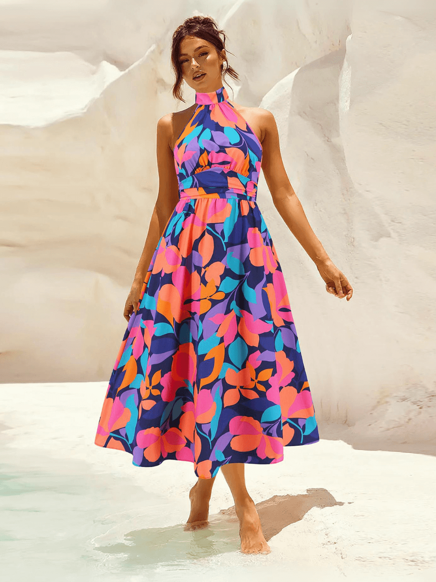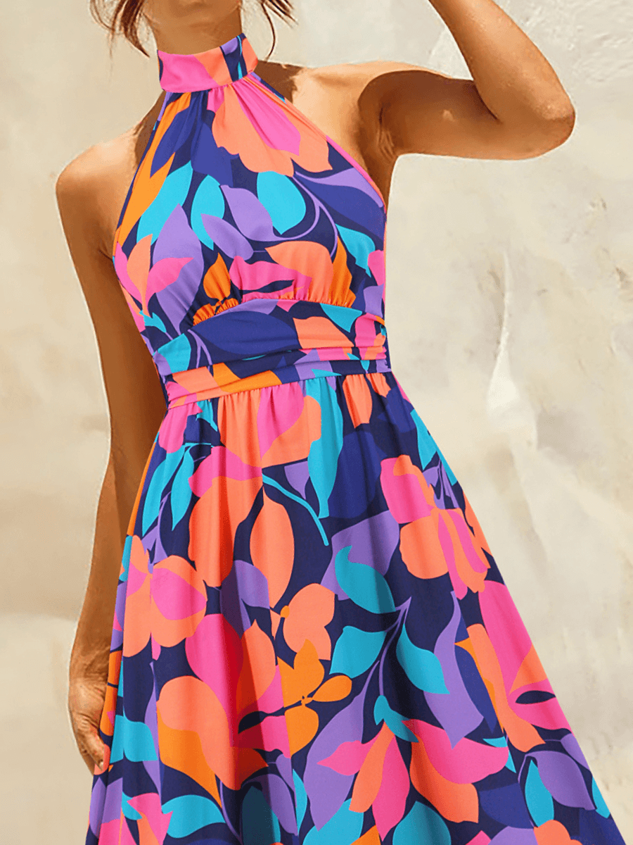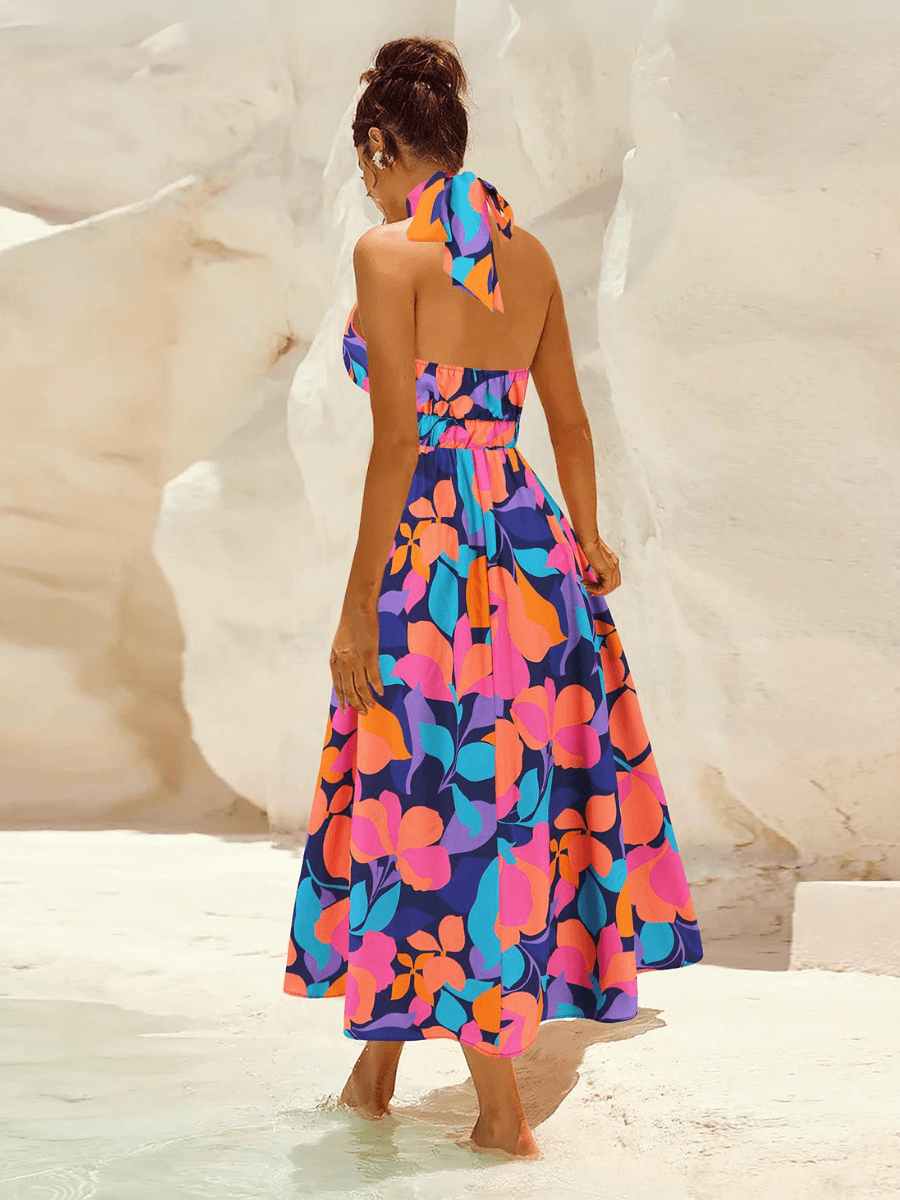 - Feature: Halter neck. Floral print. Back Neck Tie Closure. Maxi length. Lined.