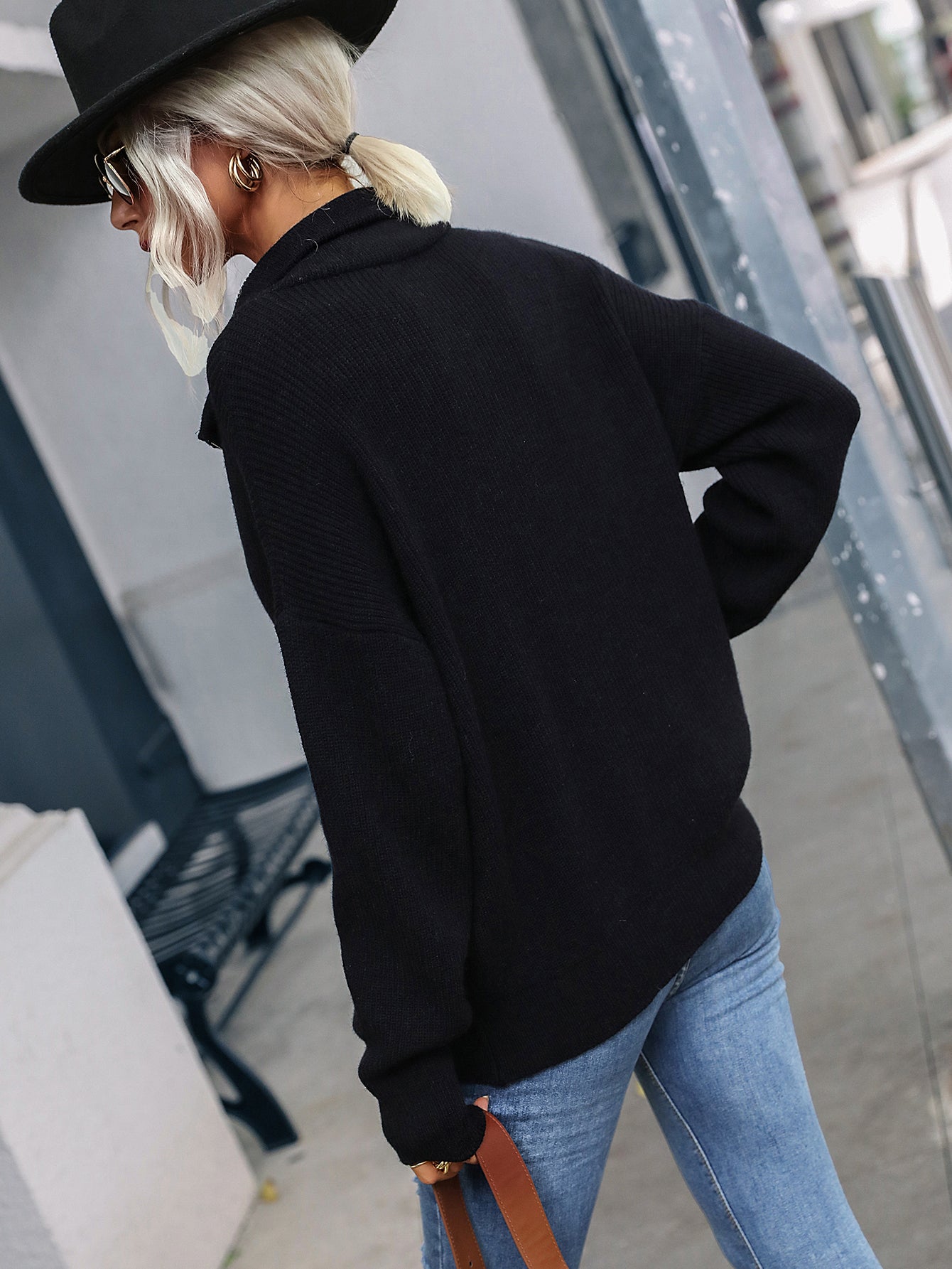 Our Ailish Knit Jacket comes in aclassicblackcolor. It features an oversized collar that comes together with a zipper, long relaxed sleeves and a contrasting rib knit pattern all over the garment. This relaxed knit is perfect for layering during the colder months ahead!
