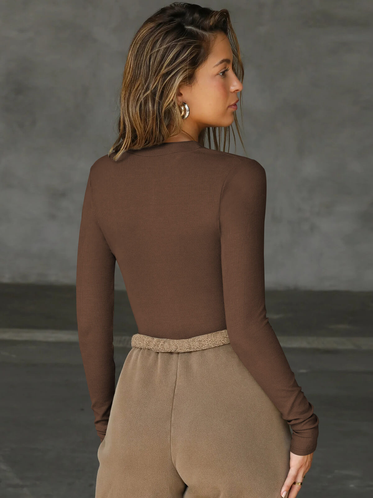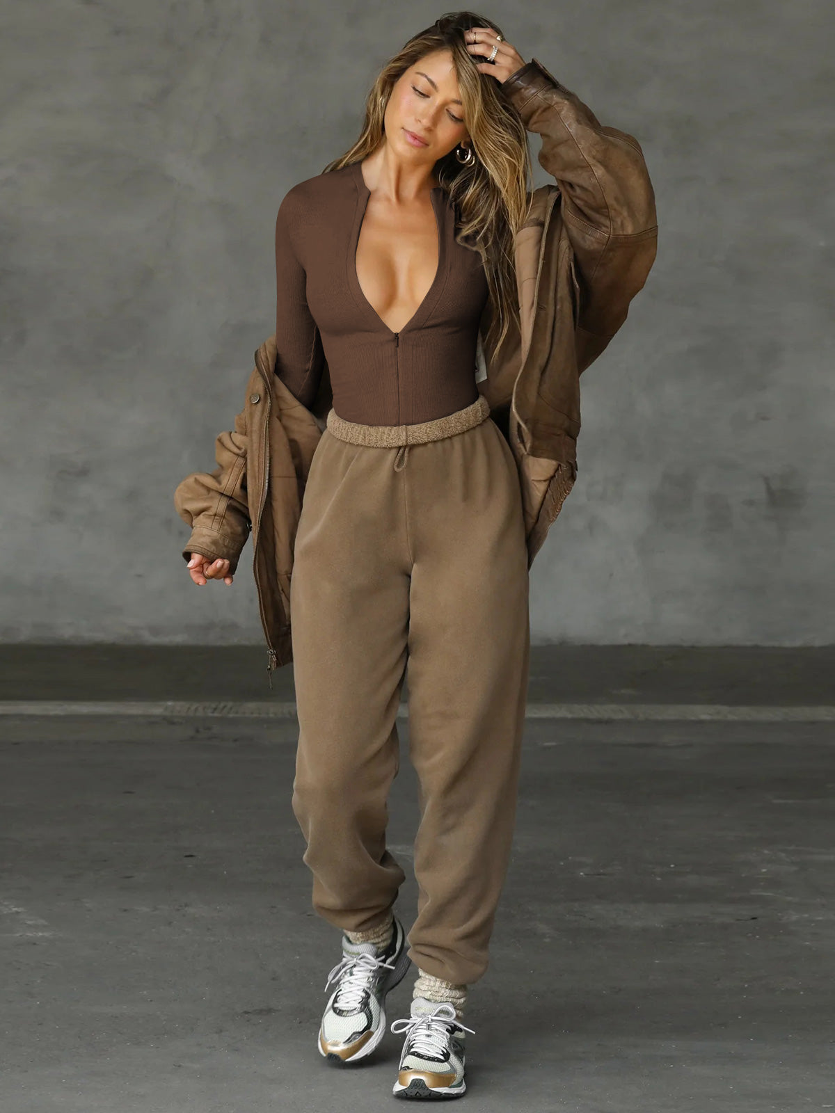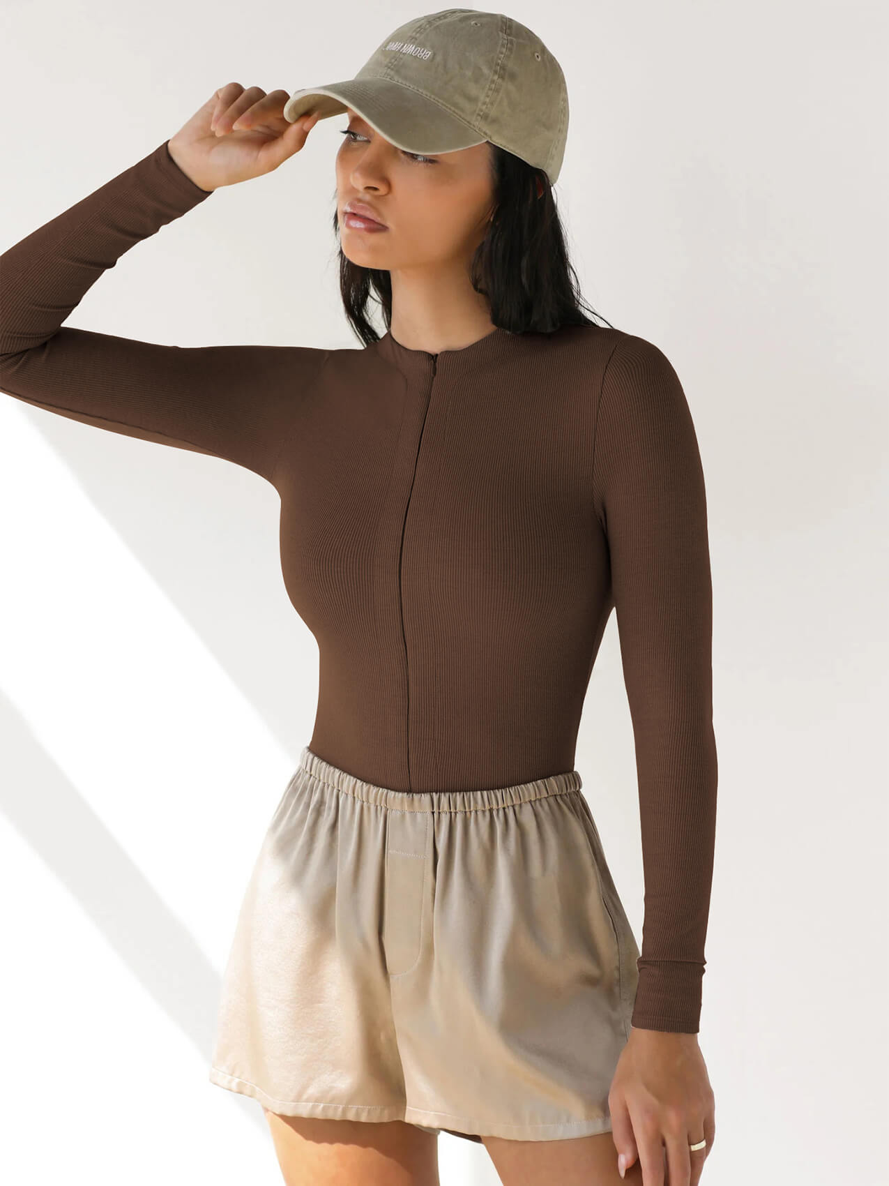 Achieve sleekness with the Alessandra Fitted Bodysuit in elegant chocolate. Its front zipper adds a playful touch (literally) while providing easy wear and a flattering fit. Dress it up or down for a versatile addition to your wardrobe. (Zip into style with this bodysuit - perfect for any occasion!)