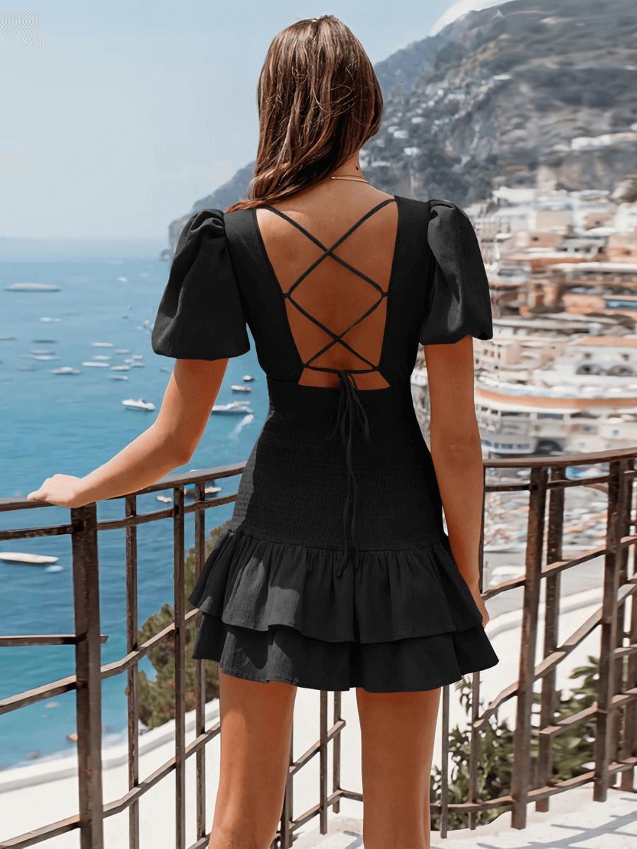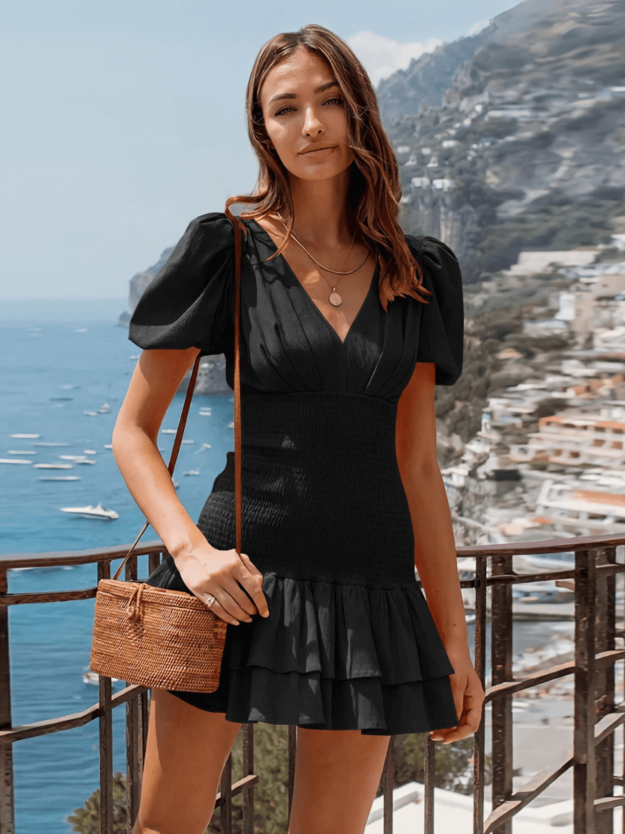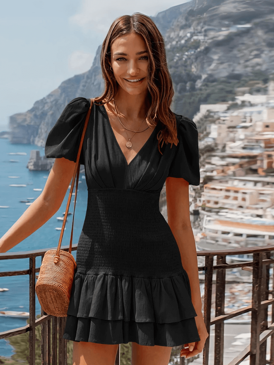 - Feature: V-Neckline. Short Puff Sleeves. Smocked Elastic Waistband. Tiered Skirt. Mini length. Back Cross Tie.