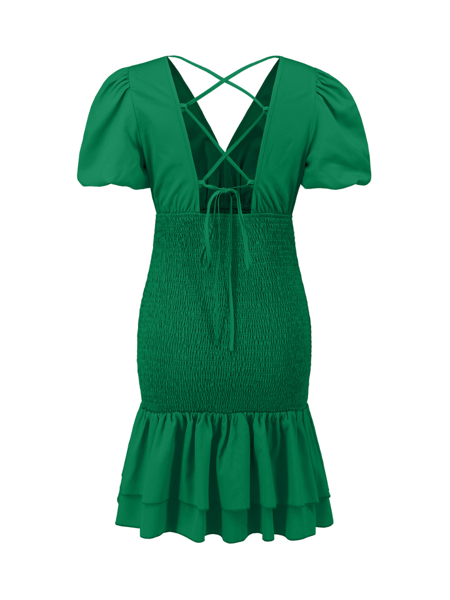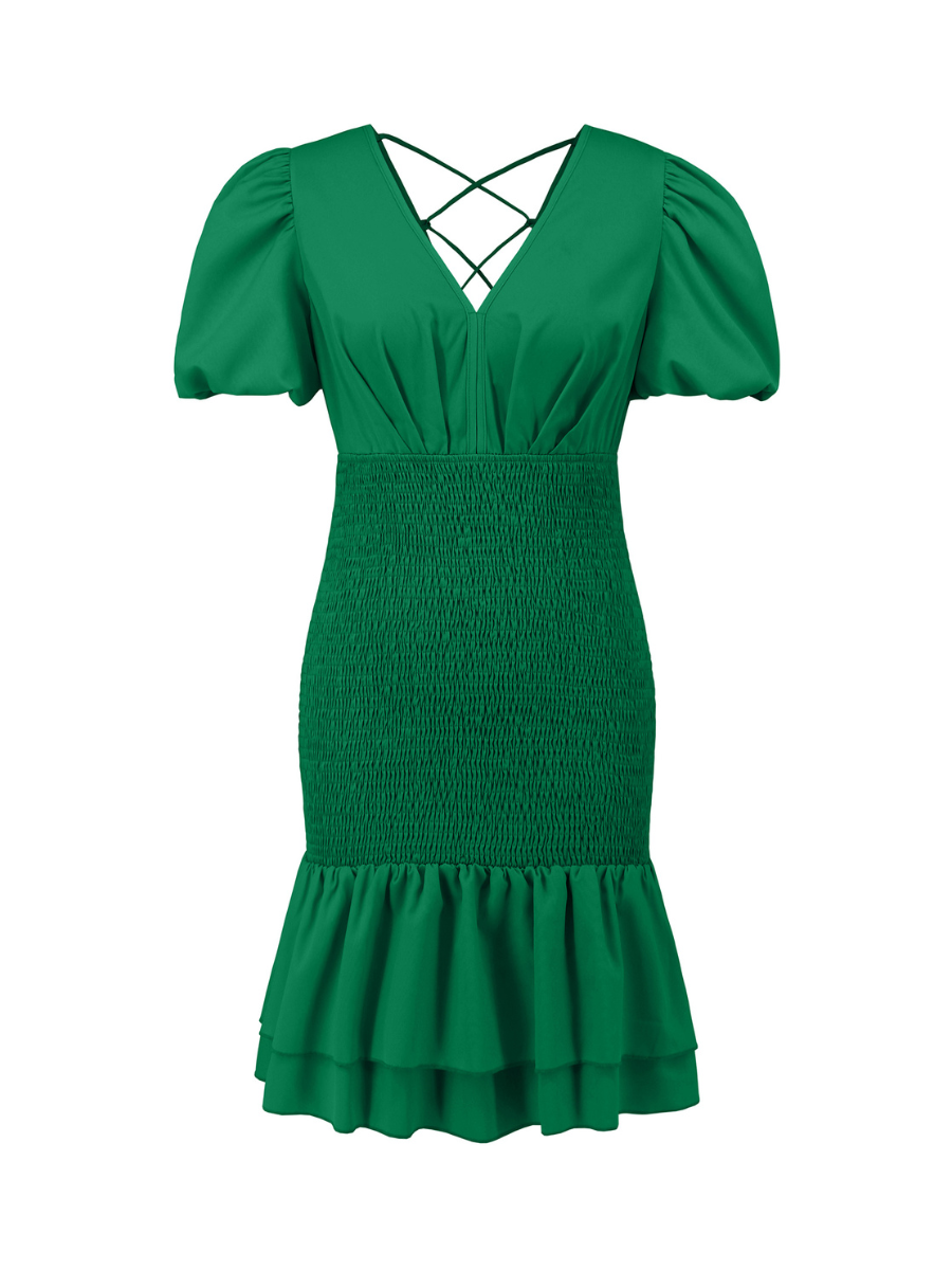 - Feature: V-Neckline. Short Puff Sleeves. Smocked Elastic Waistband. Tiered Skirt. Mini length. Back Cross Tie.