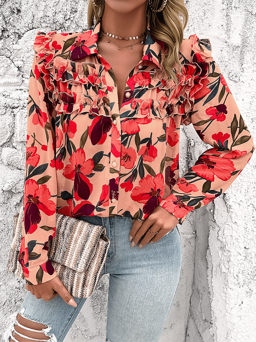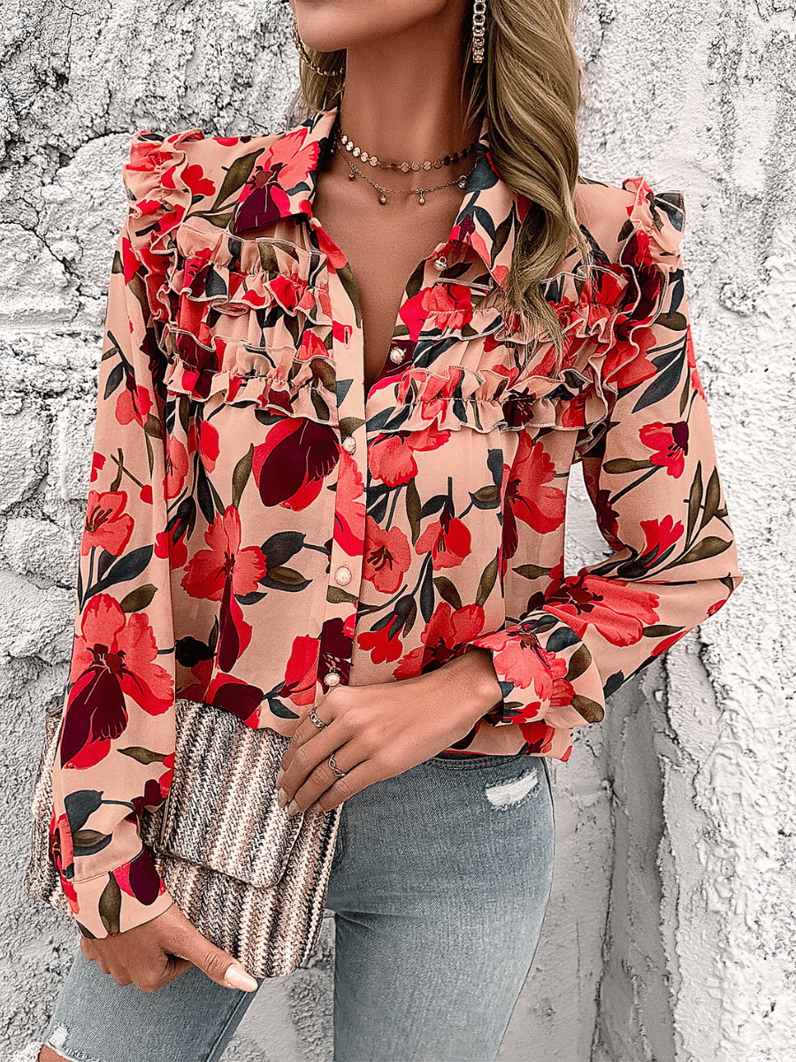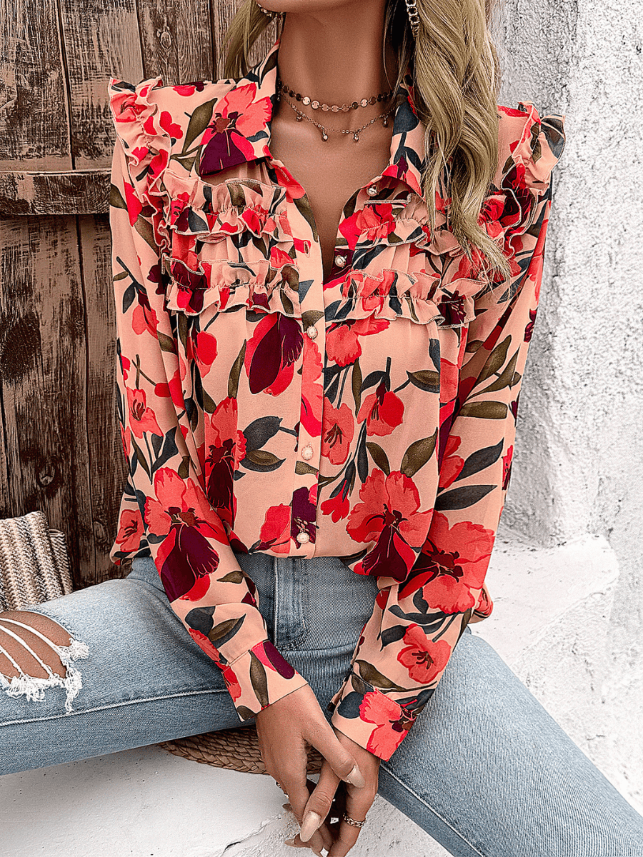 - Feature: Collared. Long sleeves. Ruffle Cap Shoulder. Floral Print. Centre-front buttons closures. No lining. No stretch. Relaxed fit.