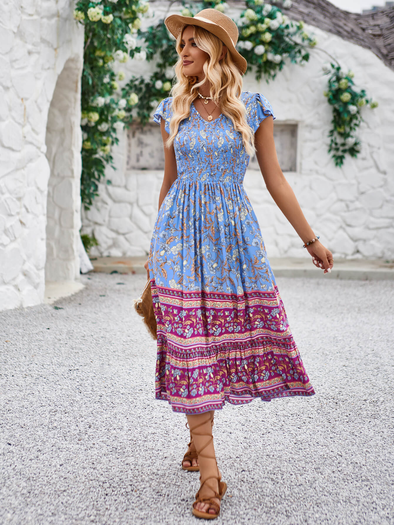 Get ready to turn heads with our Ashlyn V-Neck Tiered Midi Dress! This boho-inspired floral pattern dress is a must-have for any fashionista. Its tiered design adds a touch of fun and flow to your look, while the V-neckline is perfect for showing off some skin. Stand out in style with this playful and quirky dress.
