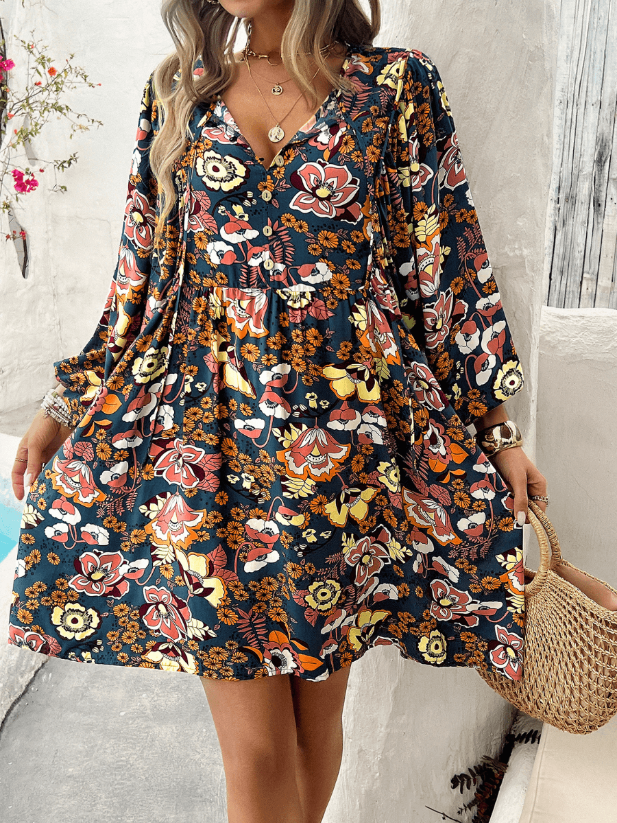 - Feature: Mini length. V-Neckline. 3/4 Puff Sleeves. Floral Print. Relaxed fit. Maternity Friendly.