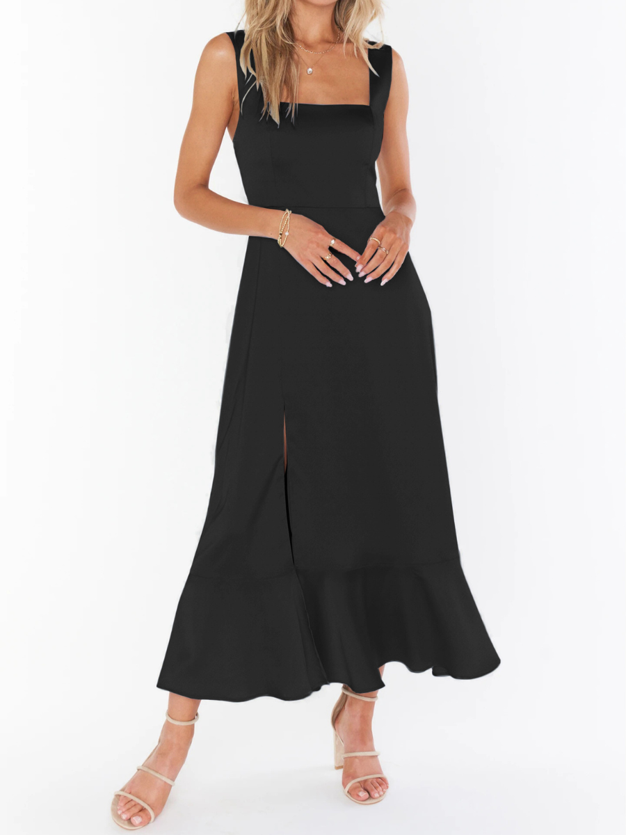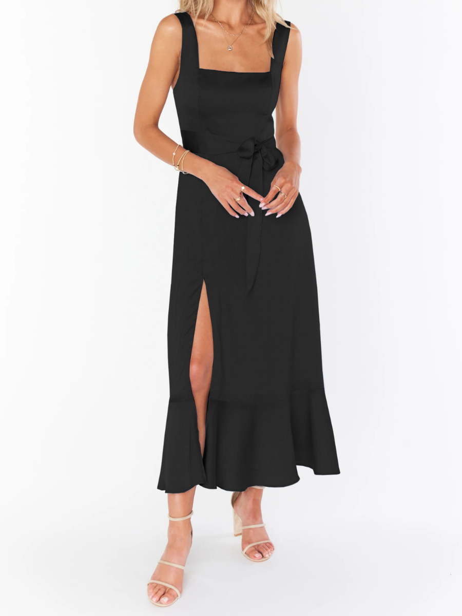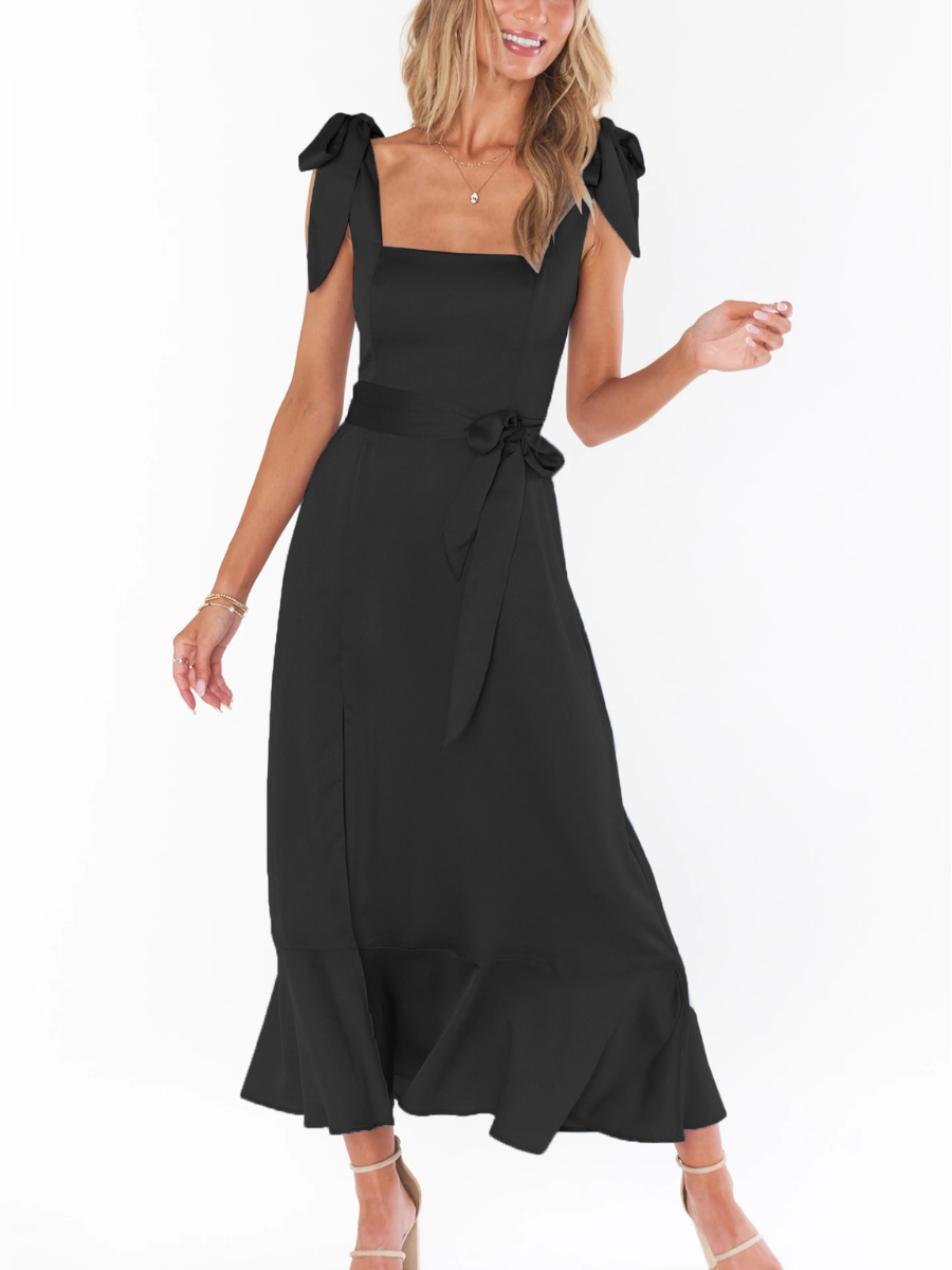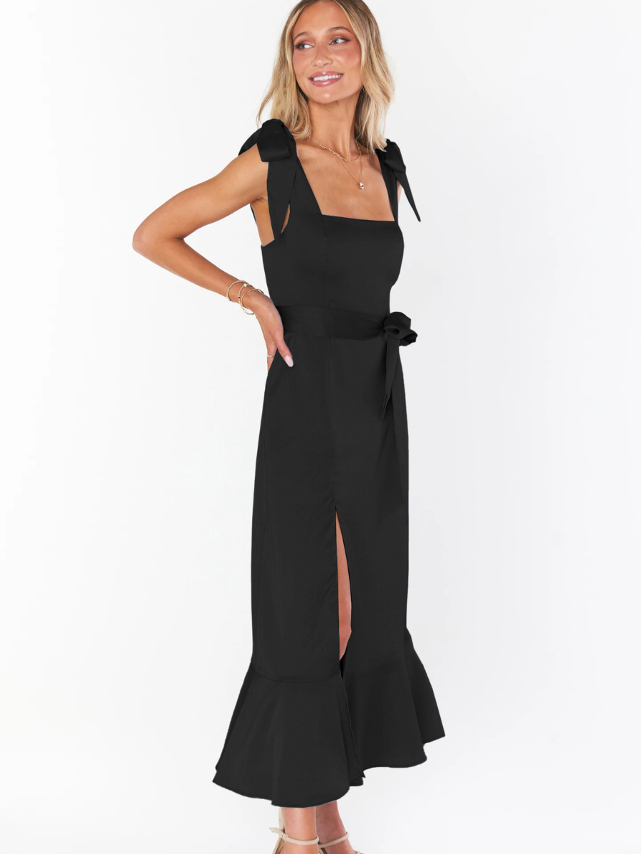 - Feature: Straight Neckline. Adjustable Shoulder Ties. Side Slit. Waist Tie. Midi Length.