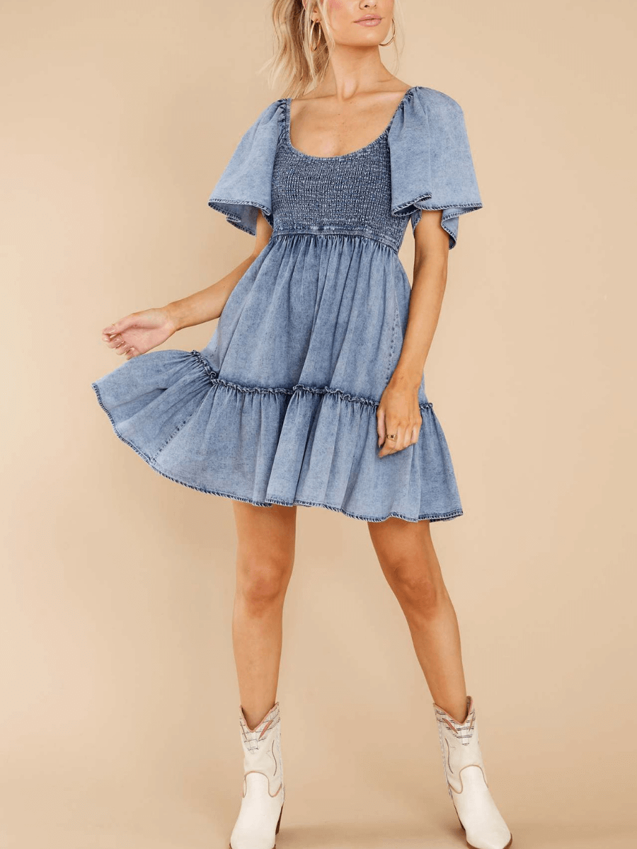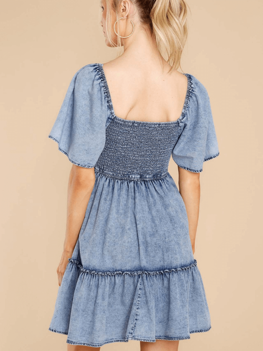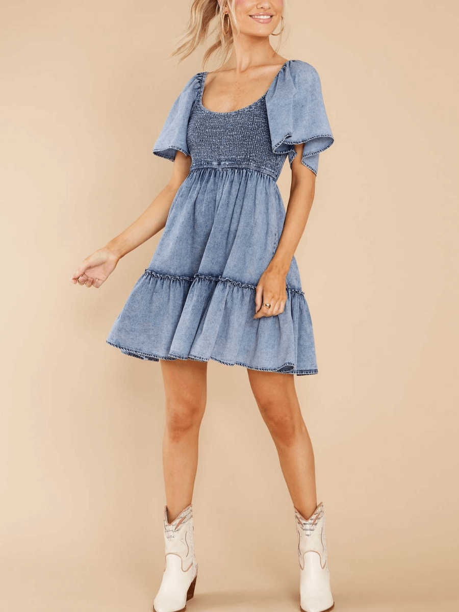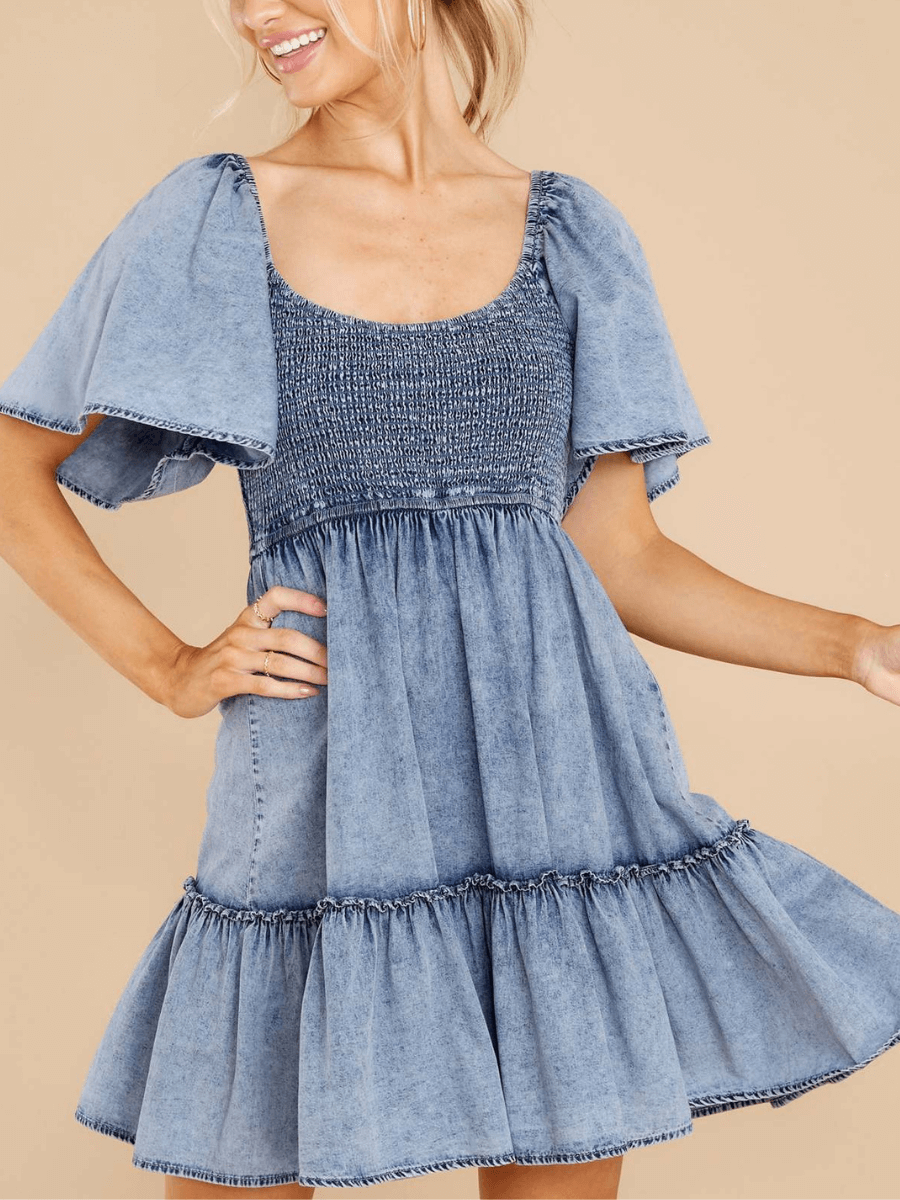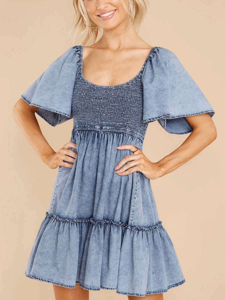 - Feature:Breathable Denim Fabrication. Short Ruffle Sleeves. Square Neckline. Smocked Bodice. Mini Length. Tiered Skirt. Relax Fit. Not Lined.