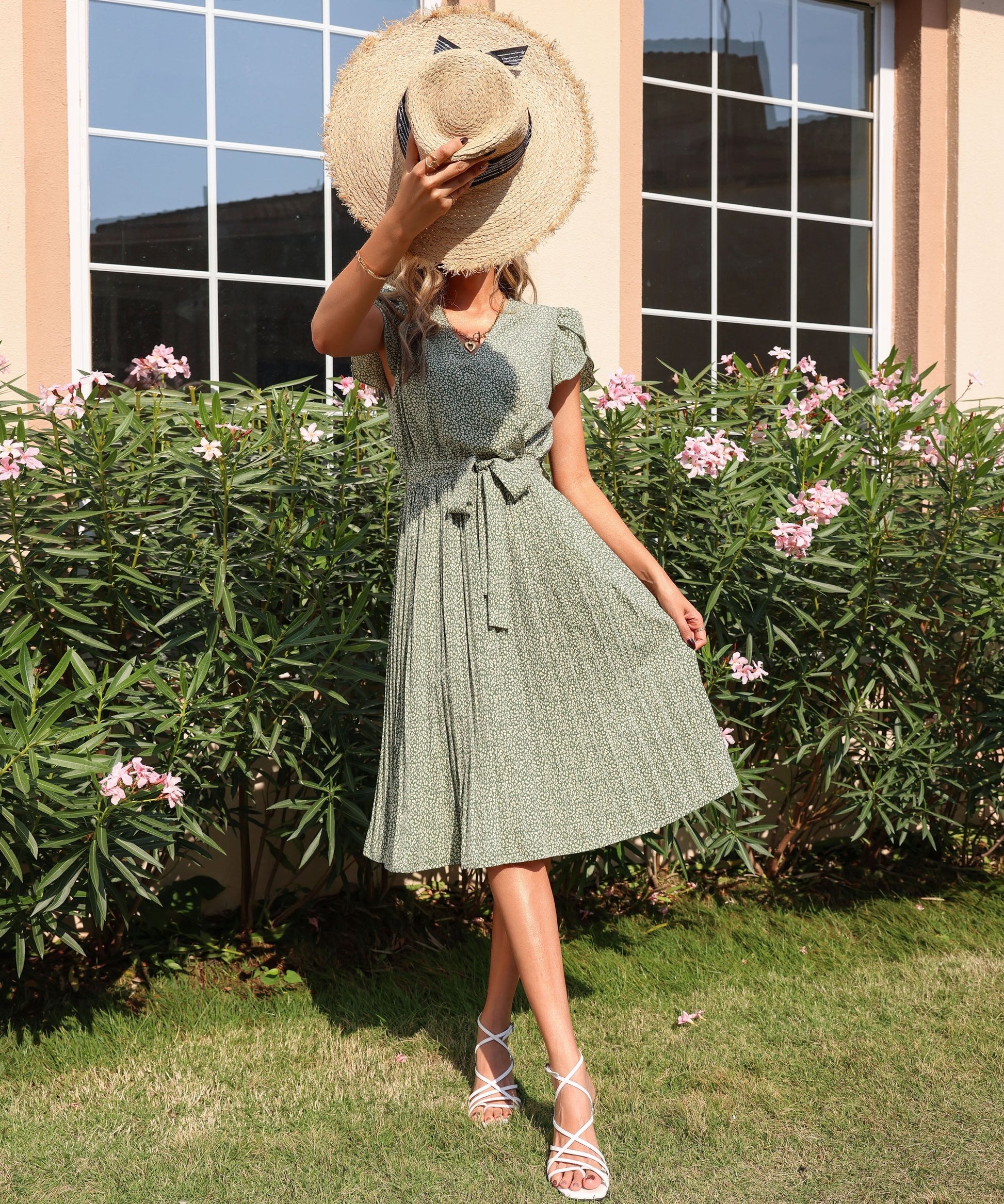 Our Bina Dress is a vibrantgreen tone base with a white flower print. This lightweight, high-low hemline dress is a relaxed, wrap fit you're sure to love. The short butterfly sleeves float with the body as you move. The waist can be adjusted by tightening the wrap tie as desired. Maternity friendly and perfect for a range of occasions like a picnic by the beach or brunch with the family.