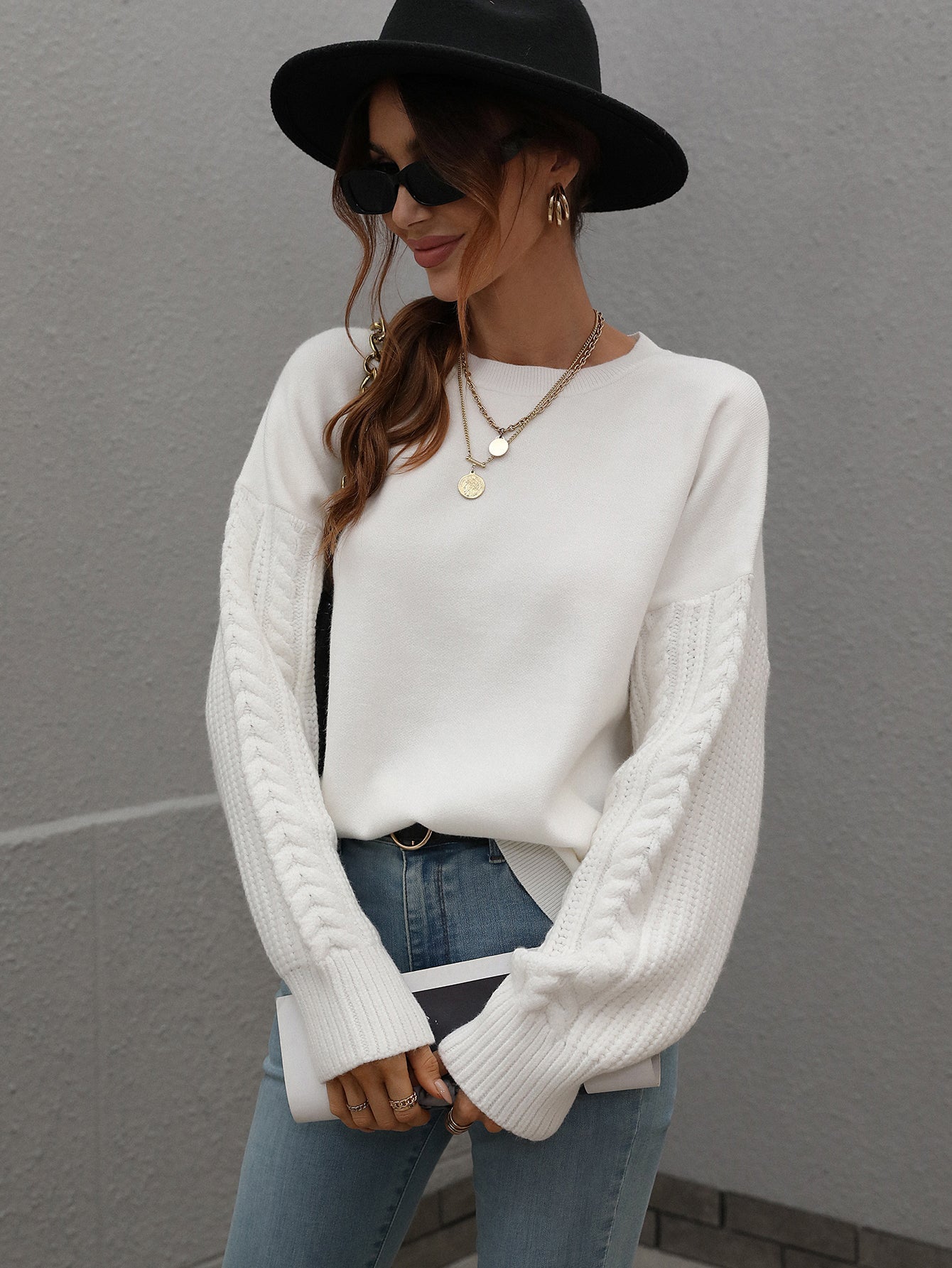 BRAIDED SLEEVE KNIT SWEATER - WHITE