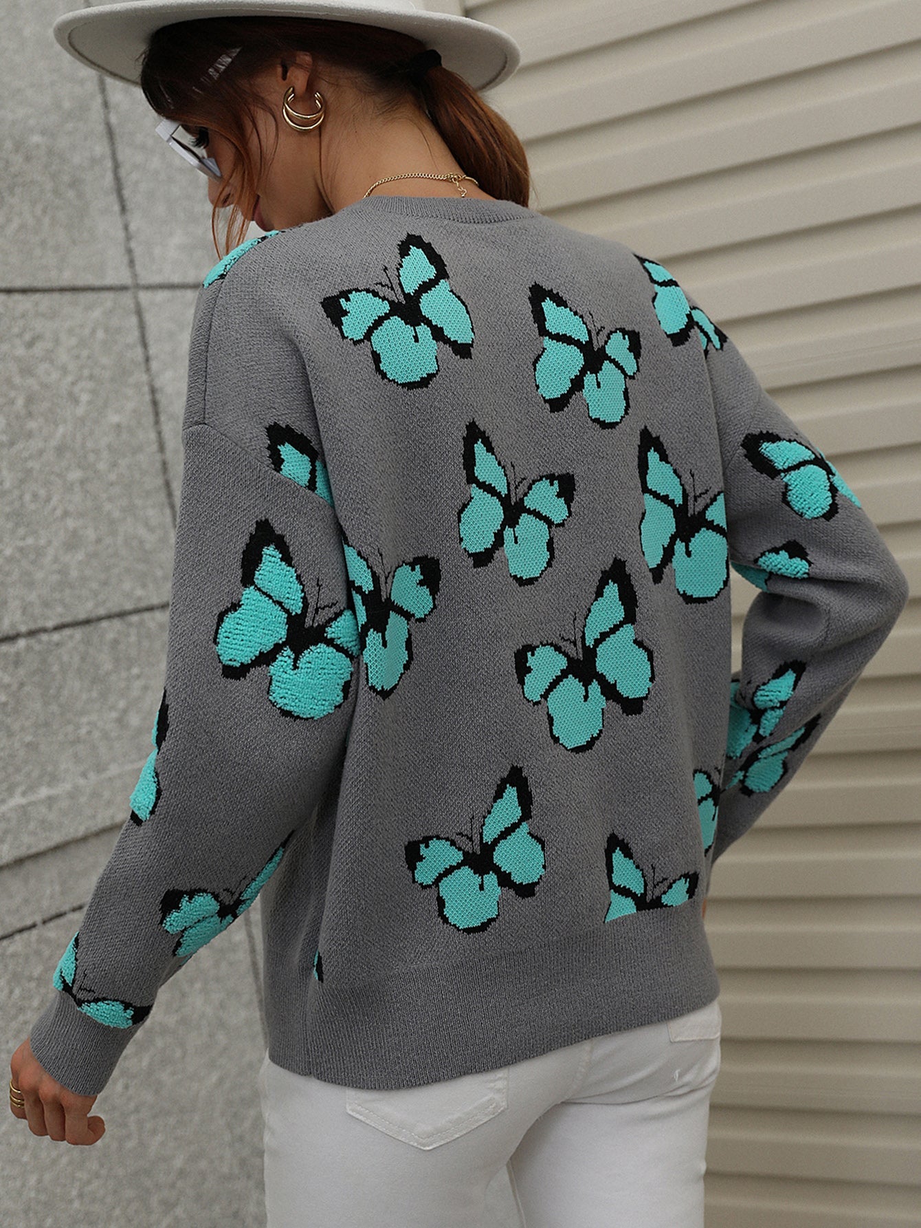 Ourbutterfly knittop comes in agrey base with blue butterfly embroidered. Your go-to chilling buddy while relaxing in the aroma of scented candles in a romantic ambience, this jumper is designed with aclassic crew collar, long relaxed sleeves. Match it withour casualankle bootsor trendycowgirl boots!