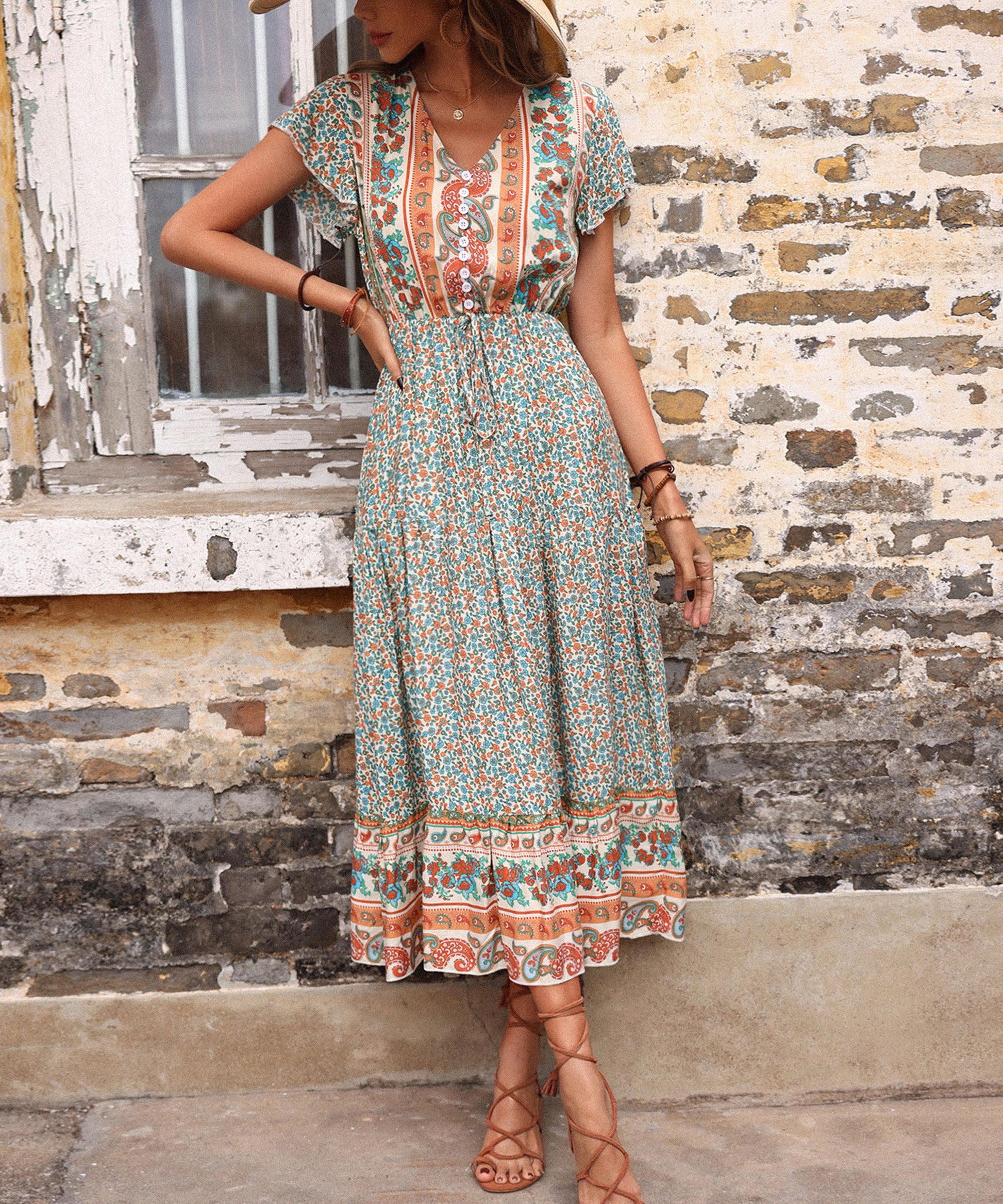 - Feature: Maxi Length. V neckline. Flowy dress. Relaxed fit. Short butterfly sleeves.