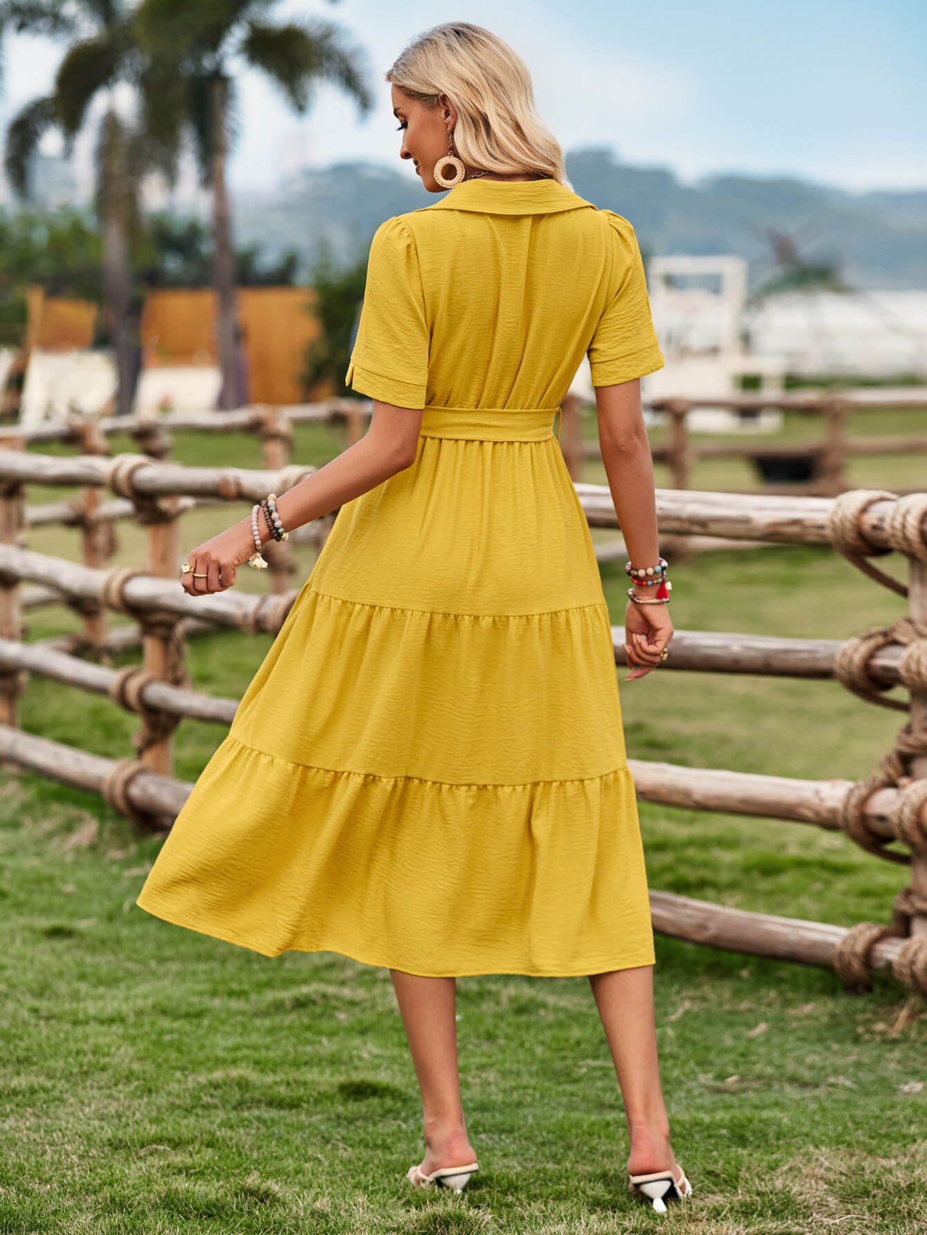 Celie Poplin Collared Tie Waist Midi Dress - Mustard
