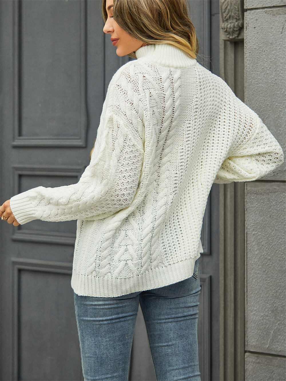 - Key Features:Highturtle neckline . Long sleeve. Ribbed Trim. Soft, chunky cable knit fabric. Relaxed fit.