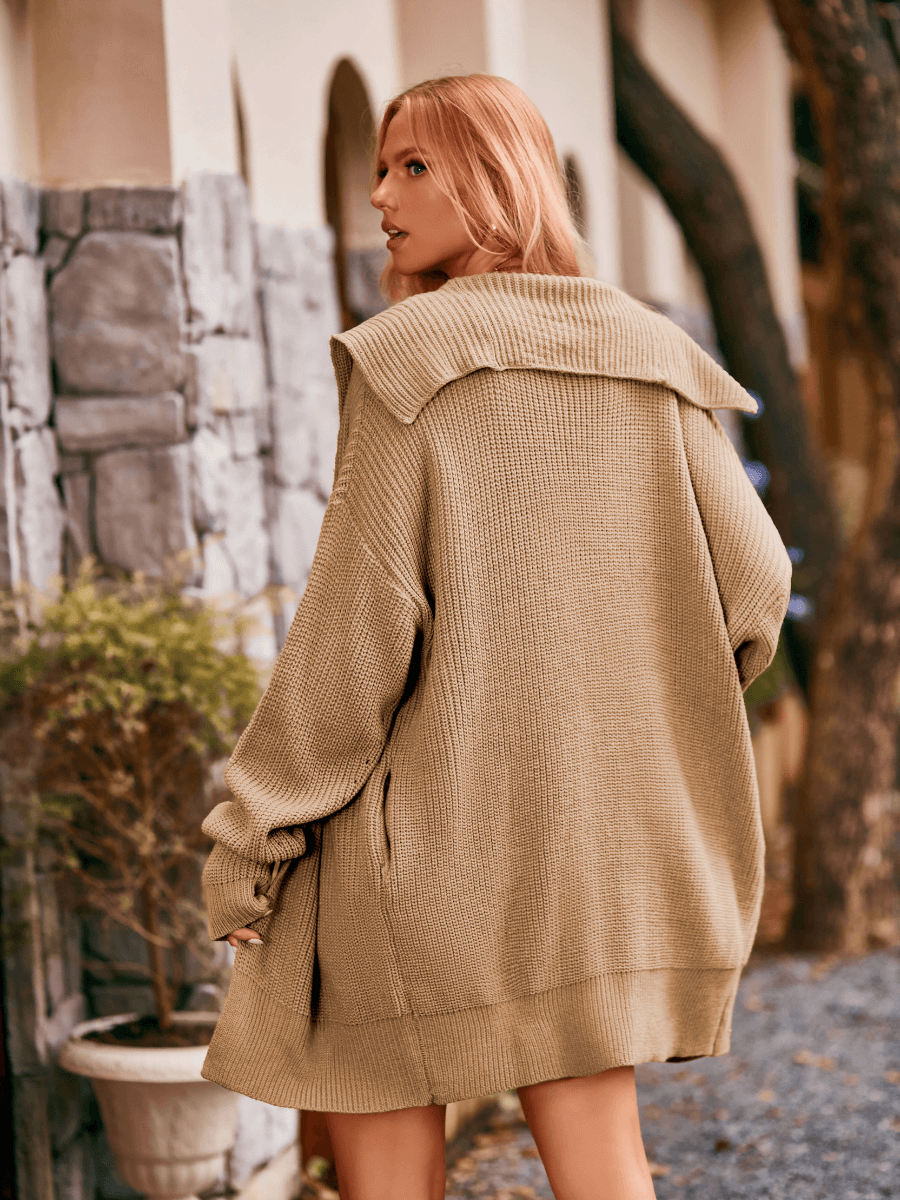 - Feature: CapCollar. Long Sleeves. Side Pockets. Knit Fabric. Front Button Closure. Relaxed Fit.