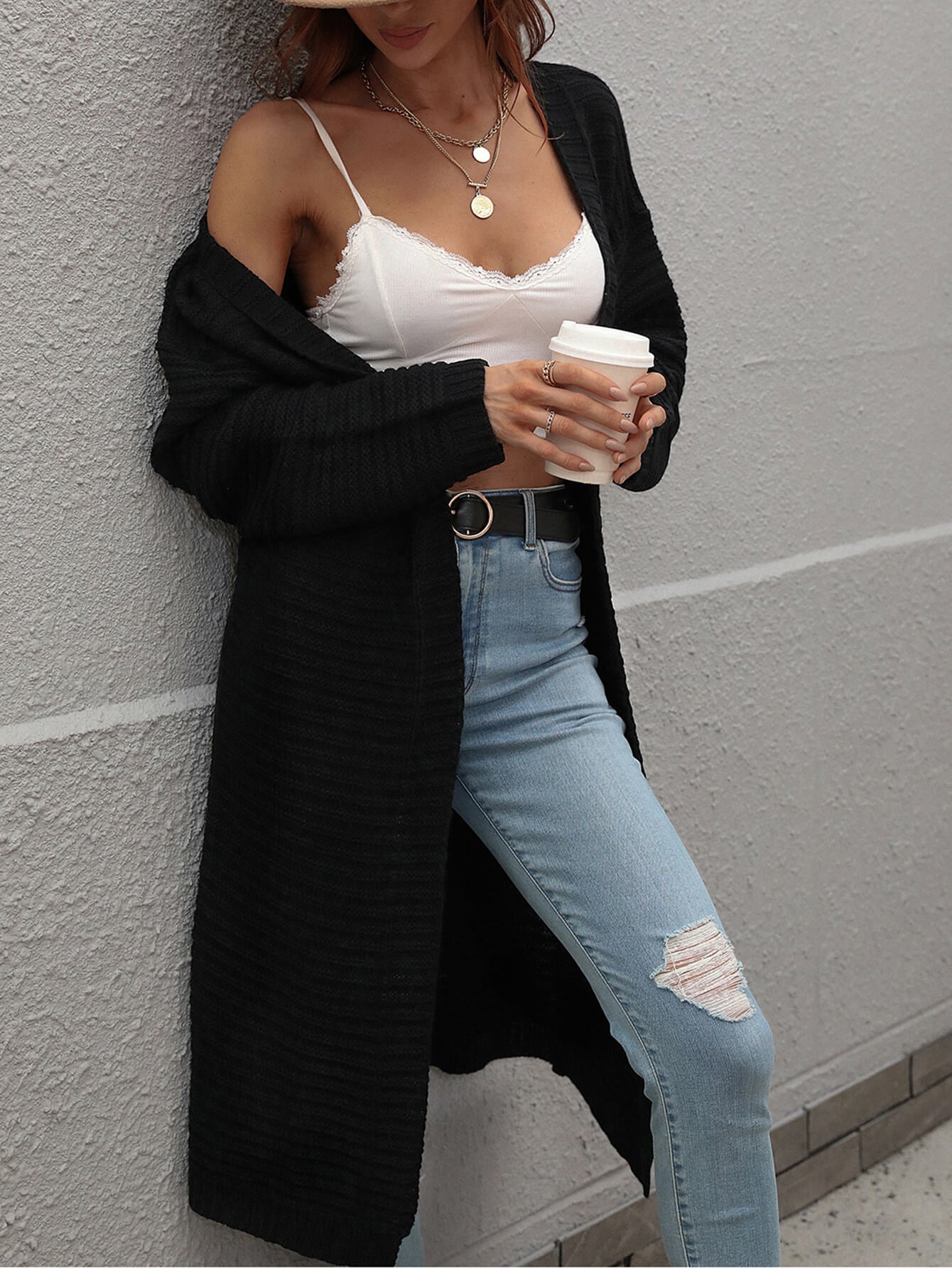 Our Drucilla Cardigan comes in ablack colour. Crafted from a fabric that's perfect for the breezy season, thiscardi features an open front, long relaxed sleeves, a side pocket, and over knee-length hem. It easily pairs with prints and plains. Pair withjeans for a lazy day outfit or complete the look with our Jady Rose Knight Luxe Boot.