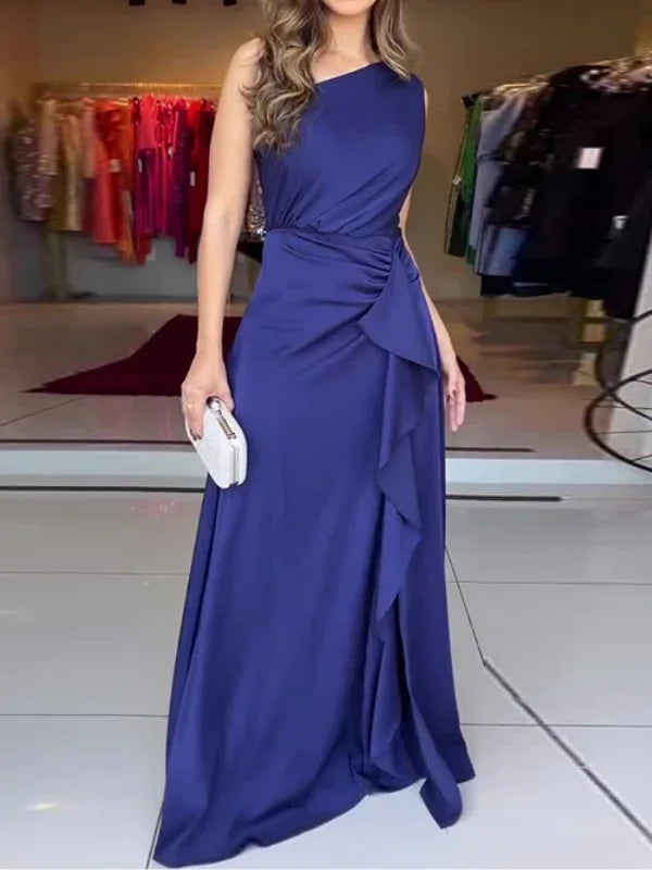 Elegant Dark Blue One Shoulder Sleeve Irregular Maxi Dress