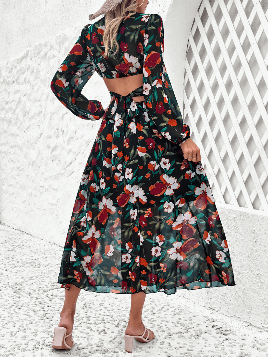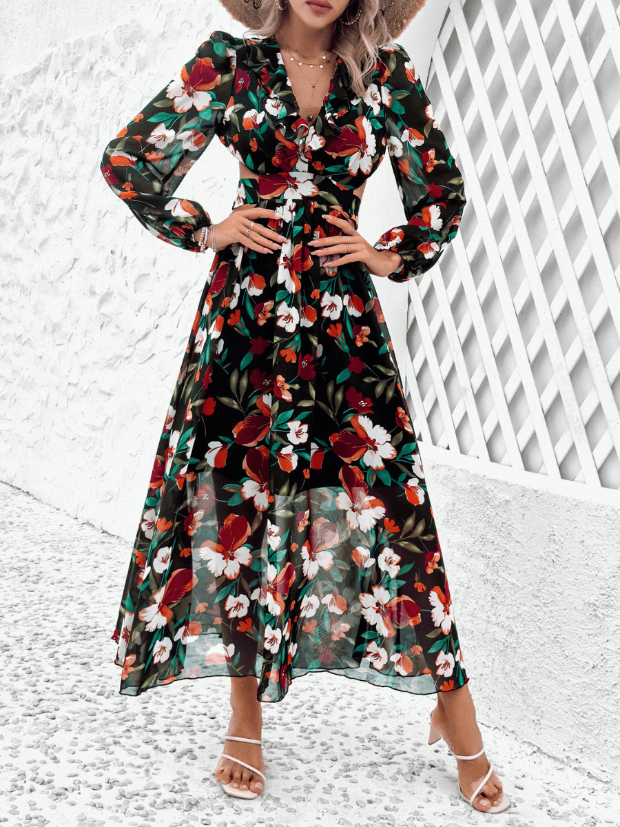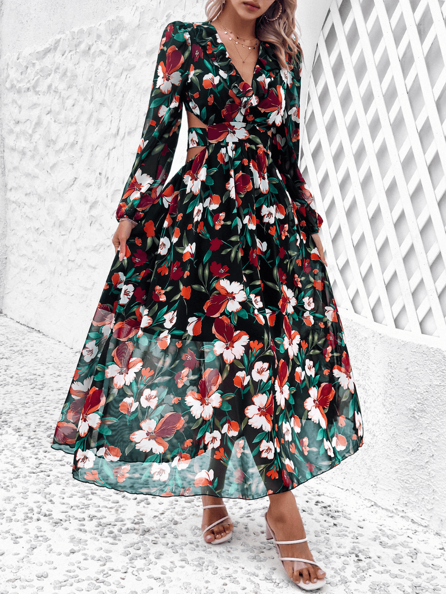 - Feature: V-Neckline. Long Sleeves. Floral Prints. Back tie. Cut-out waist. Lined. Maxi length.