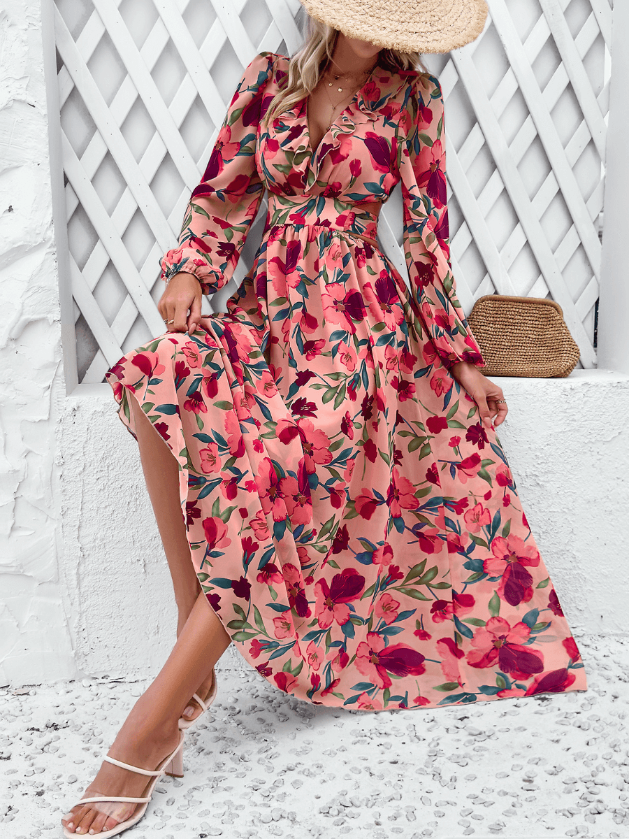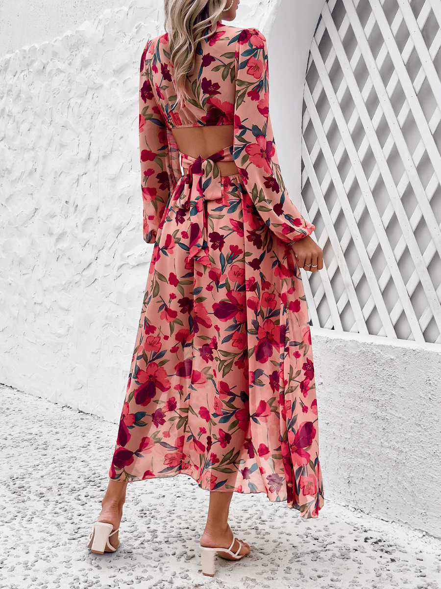 - Feature: V-Neckline. Long Sleeves. Floral Prints. Back tie. Cut-out waist. Lined. Maxi length.