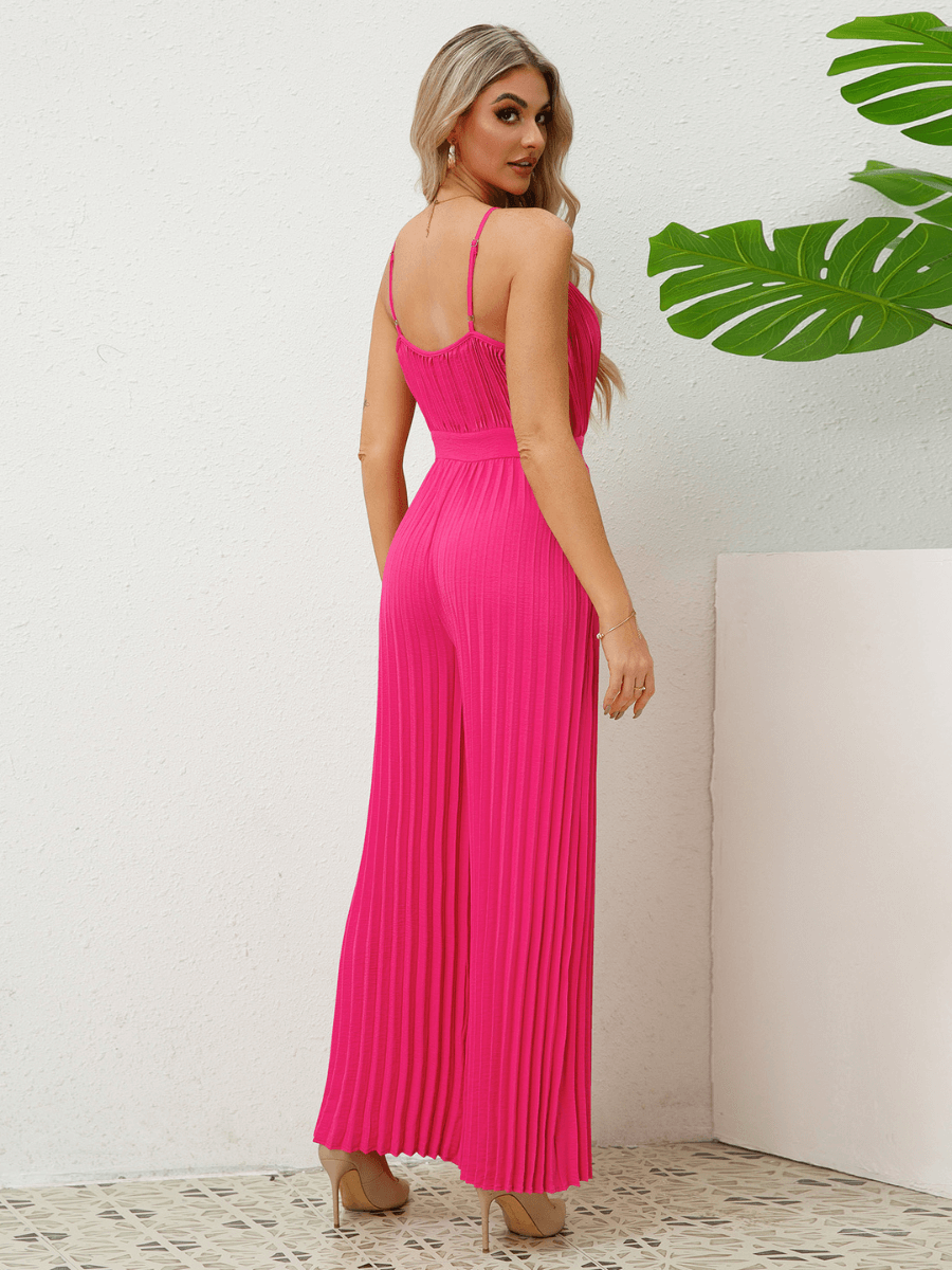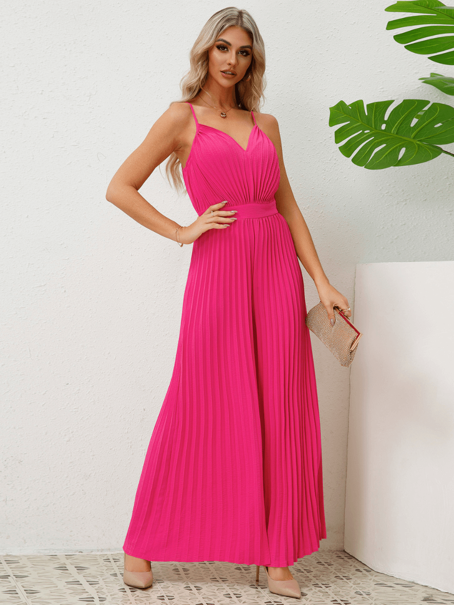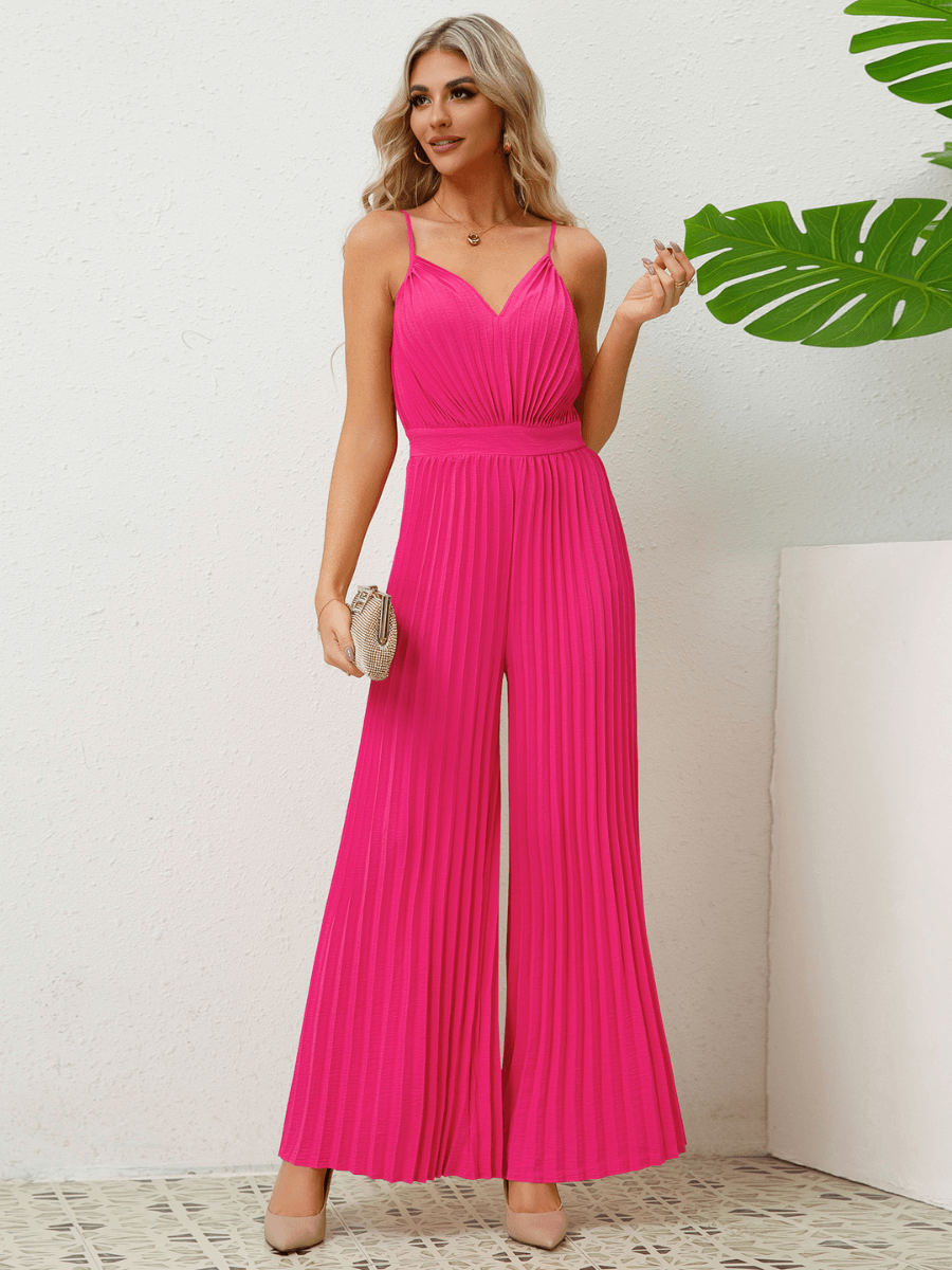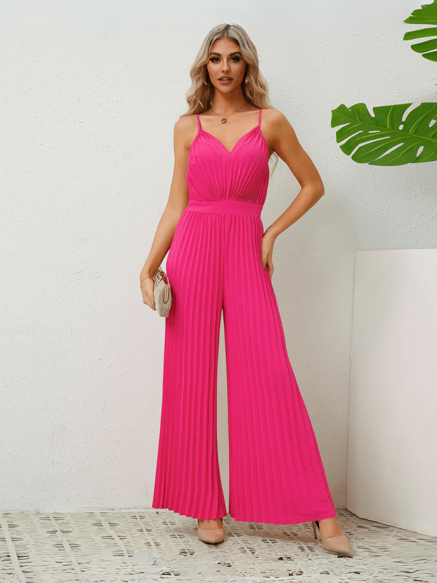 - Feature: V-Neckline. Adjustable Spaghetti Shoulder Straps. Wide Leg Fit. Plisse Fabrication Details. Relaxed fit. Not Lined.