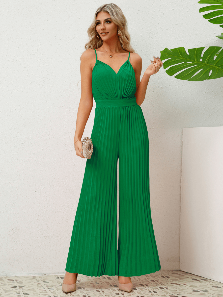 - Feature: V-Neckline. Adjustable Spaghetti Shoulder Straps. Wide Leg Fit. Plisse Fabrication Details. Relaxed fit. Not Lined.