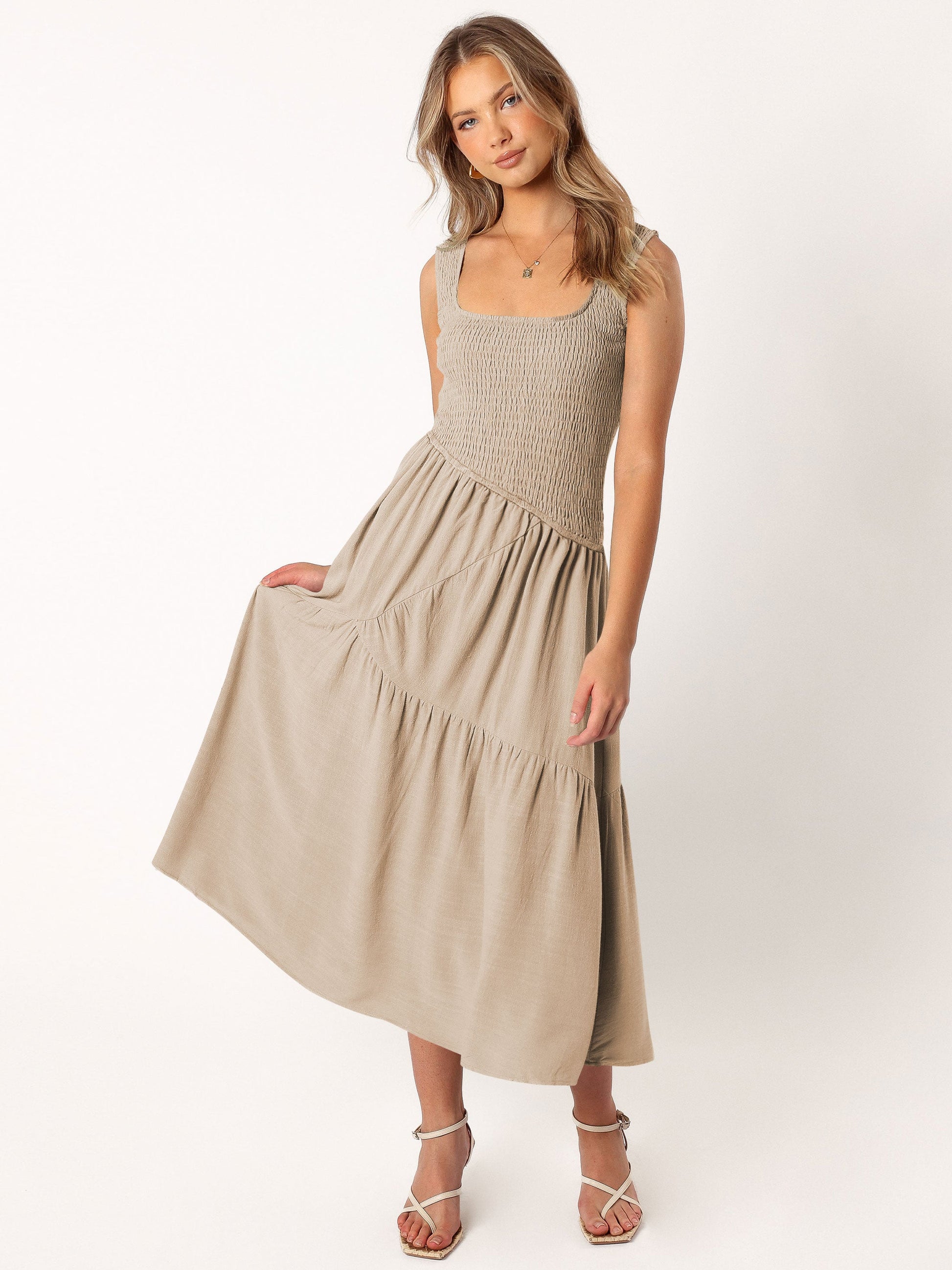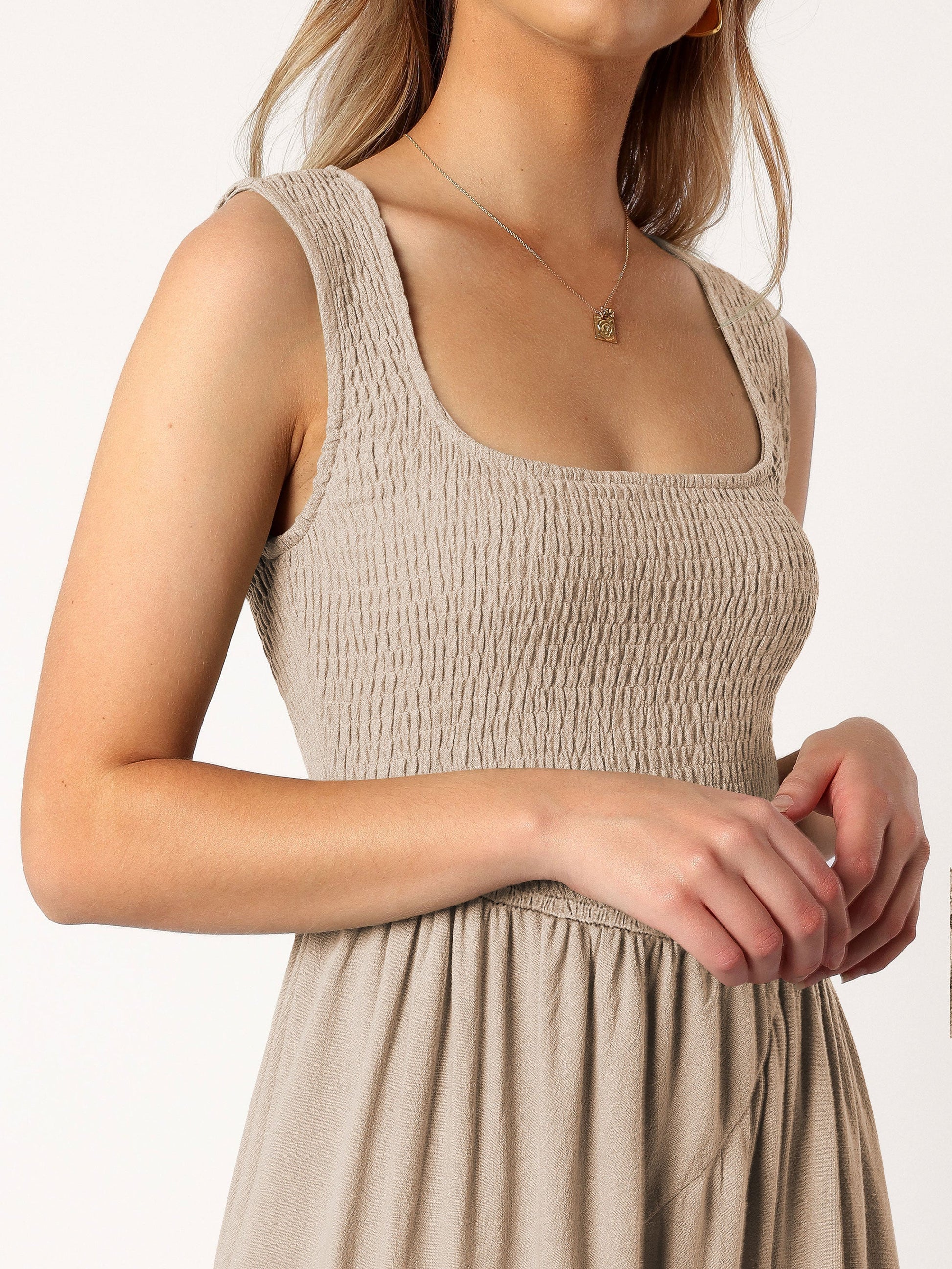- Feature: Square neckline. Sleeveless. Maxi length. Smocked Body. Flowy fit.