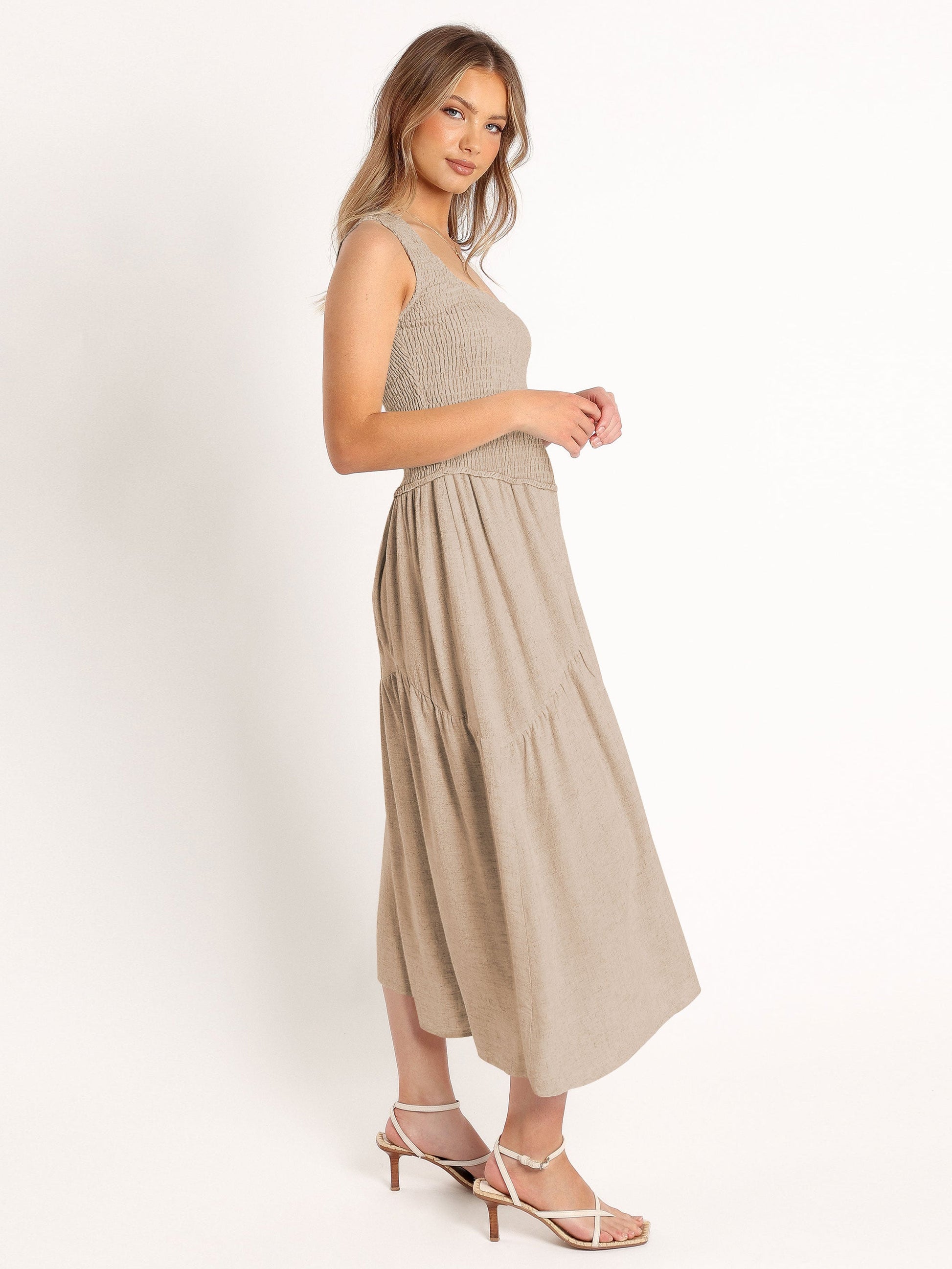 Channel your inner bohemian goddess with our Feminine Frills Smocked Maxi Dress in stunning neutral. Designed with delicate smocking and feminine frills, this dress is perfect for any occasion. Embrace your free-spirited style in comfort and style. (Now that's a dress worth twirling in!)
