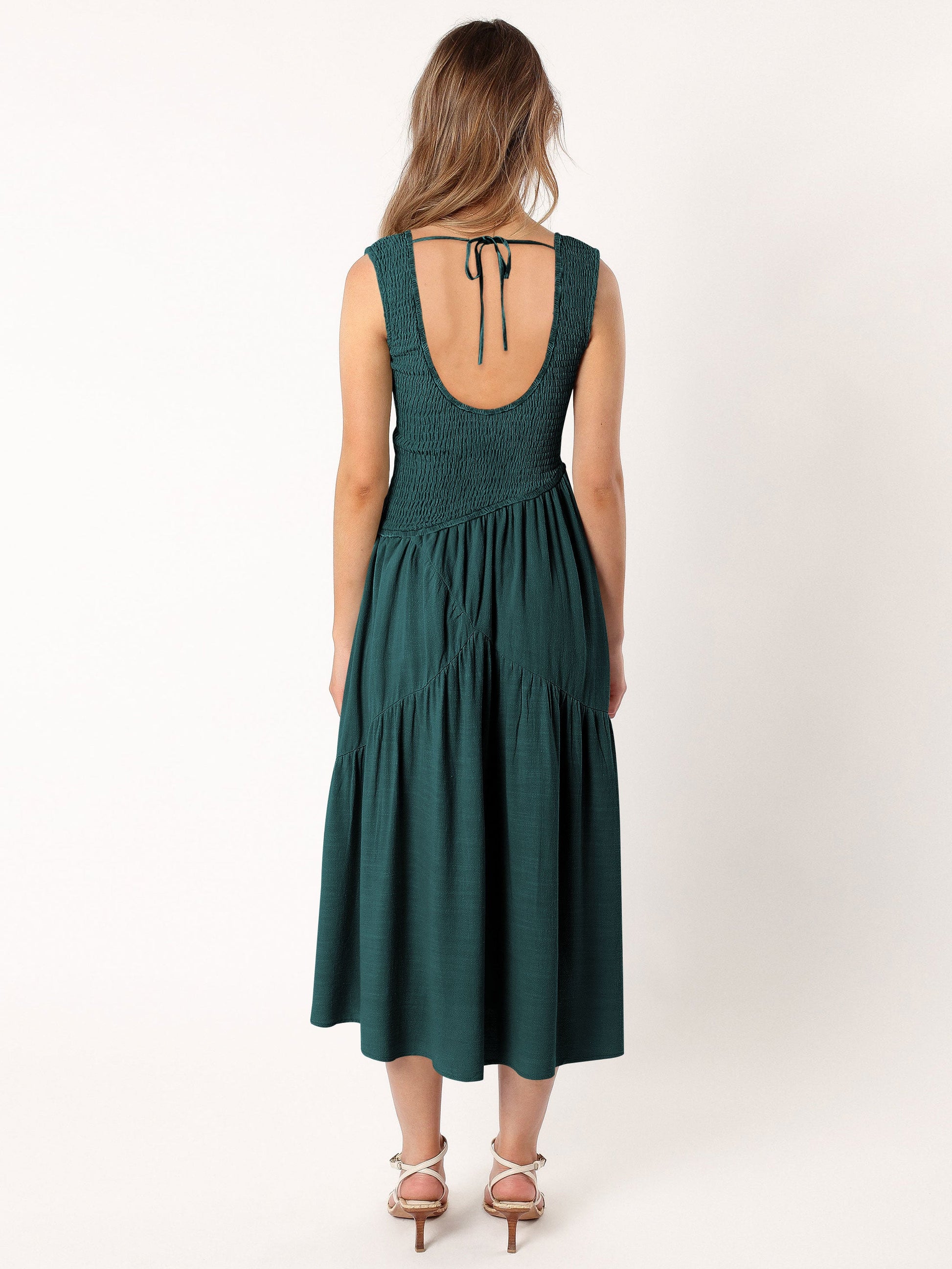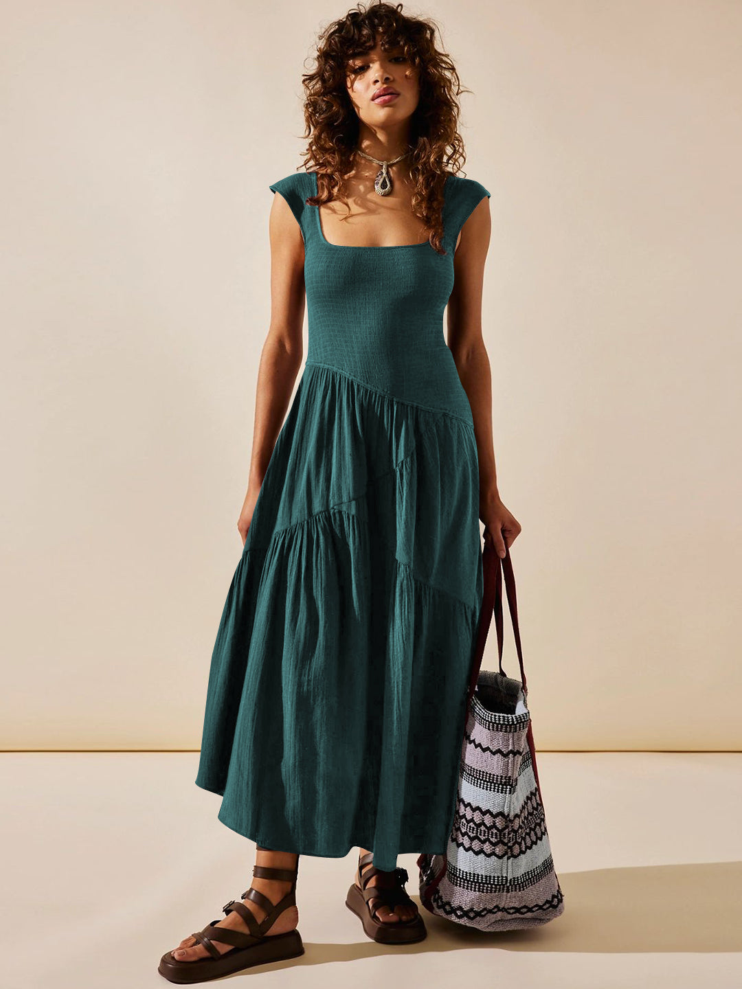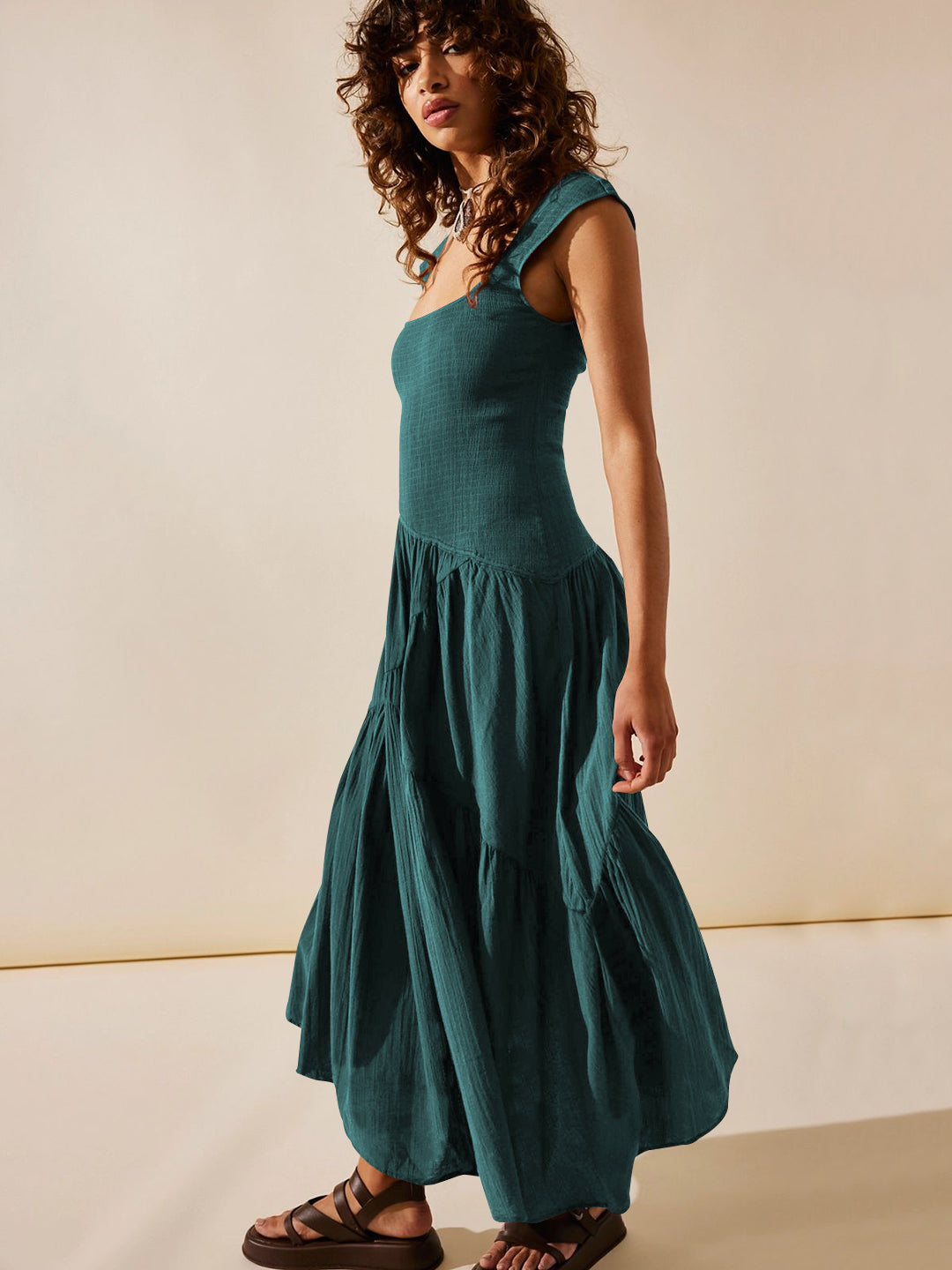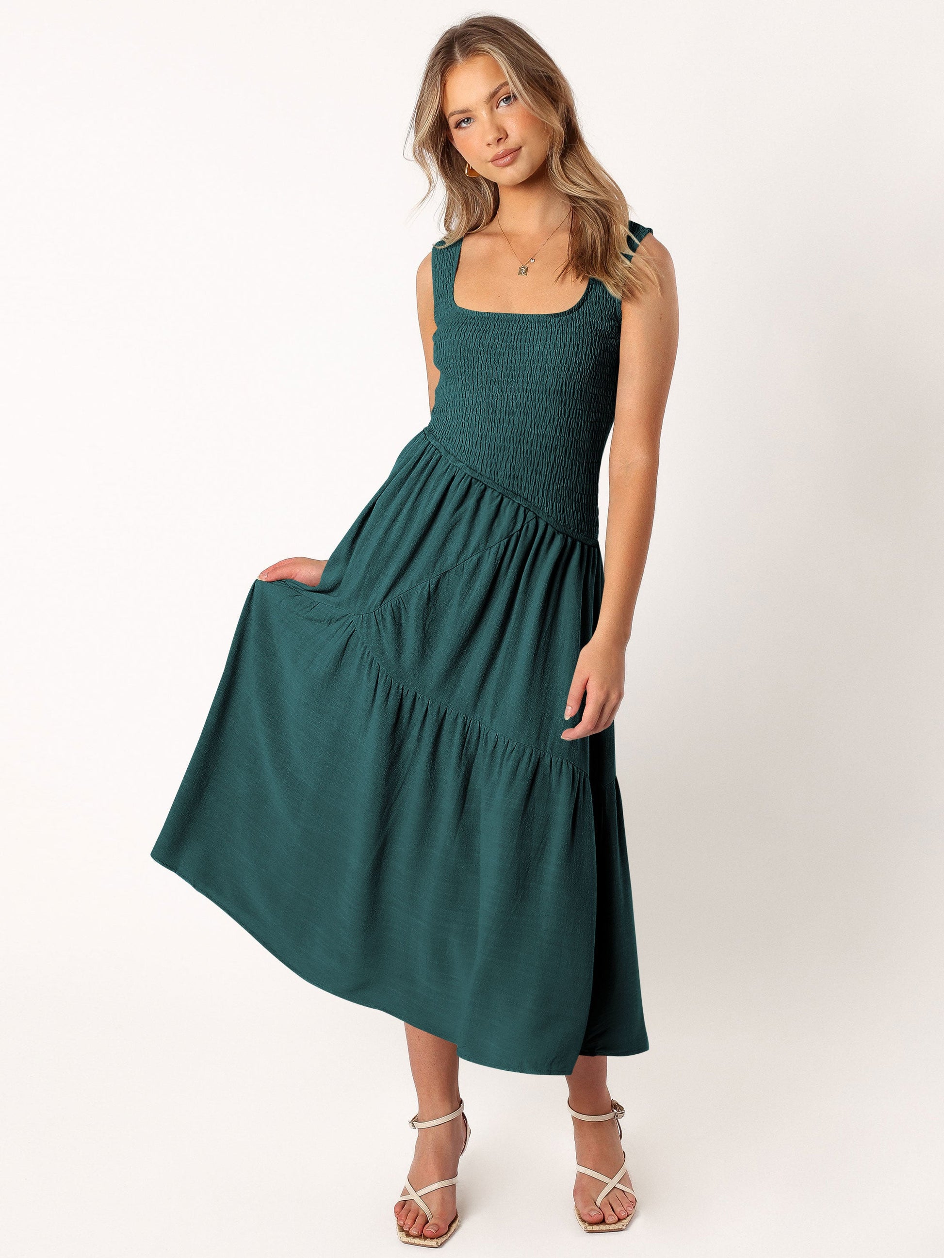 - Feature: Square neckline. Sleeveless. Maxi length. Smocked Body. Flowy fit.