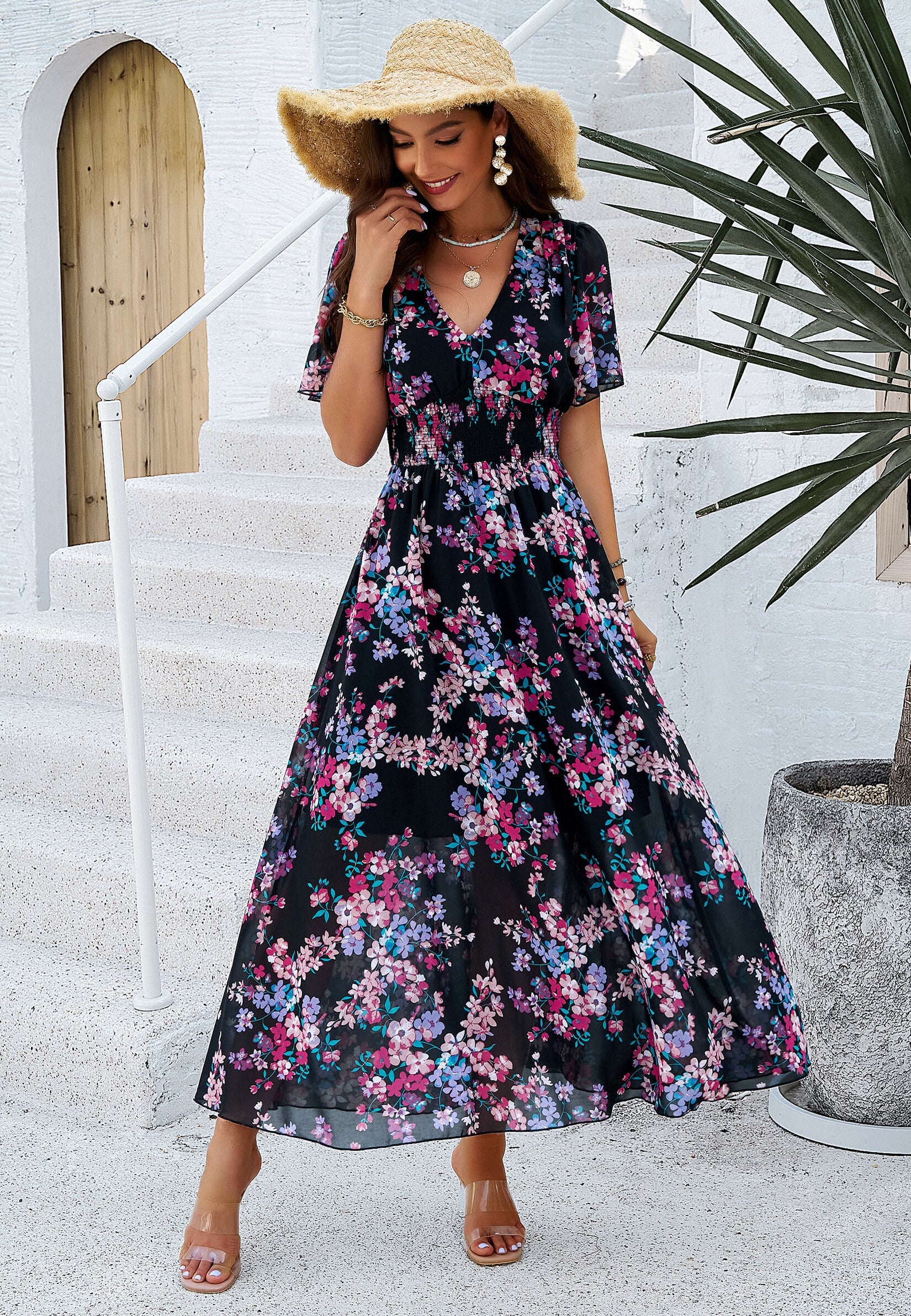 - Feature: V-Neckline. Short Sleeves. Smock elastic waist. Floral Prints. Lined. Maxi length.