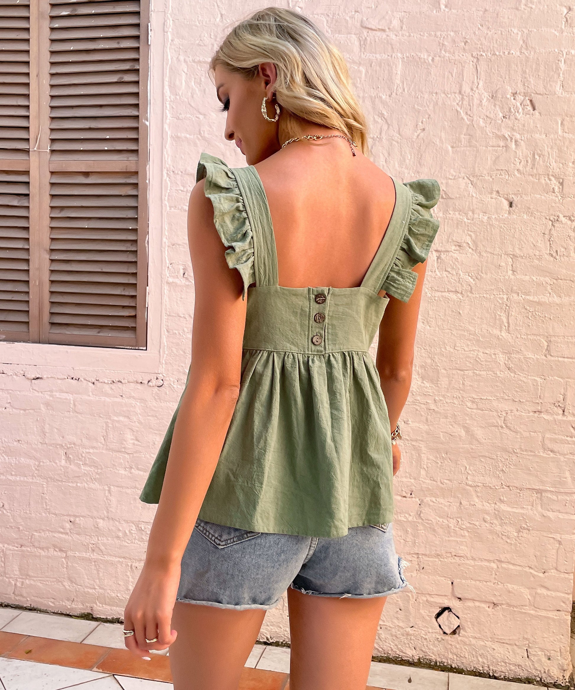 Our GracielaTop comes in a sage greentone color. This features asquare neckline, Ruffle shoulders. The relaxed fit pairs beautifully with shorts or jeans, tan sandals, and minimal gold accessories!