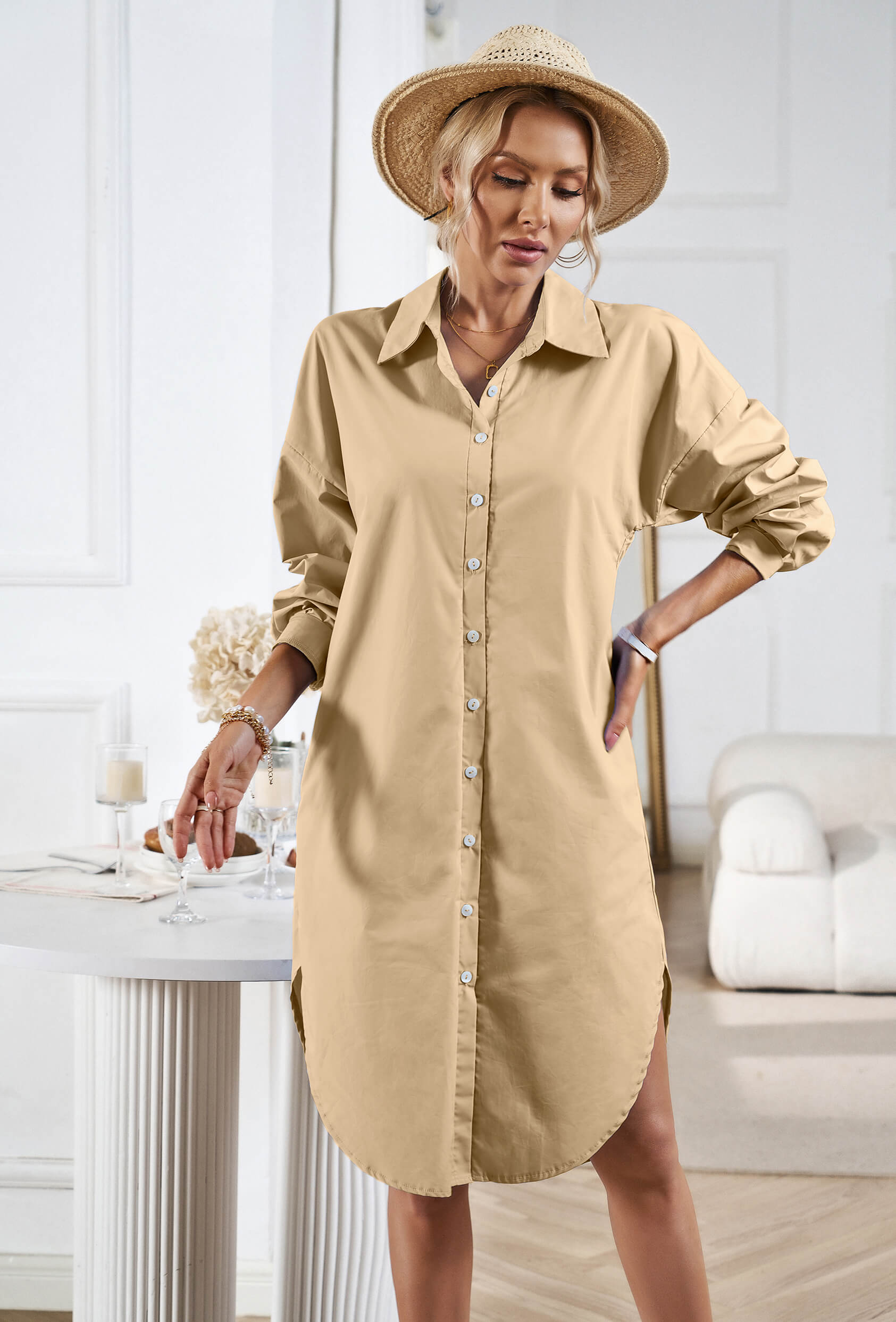 Unleash your inner fashionista with our Halia Collared Button Down Midi Shirt Dress! This dress features a sophisticated collared neckline and a button-down front, creating a chic and polished look. Perfect for any occasion, this dress is sure to turn heads with its elegant midi length and classic taupe color. Upgrade your wardrobe with our versatile and stylish Halia boyfriend shirt dress!