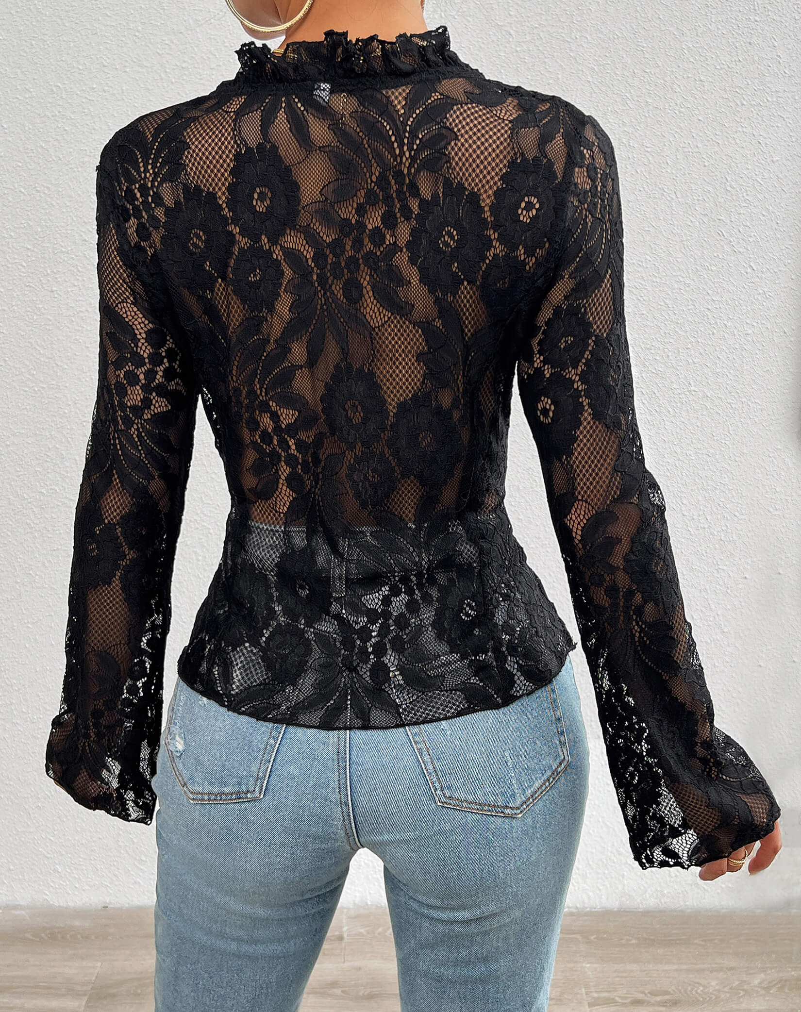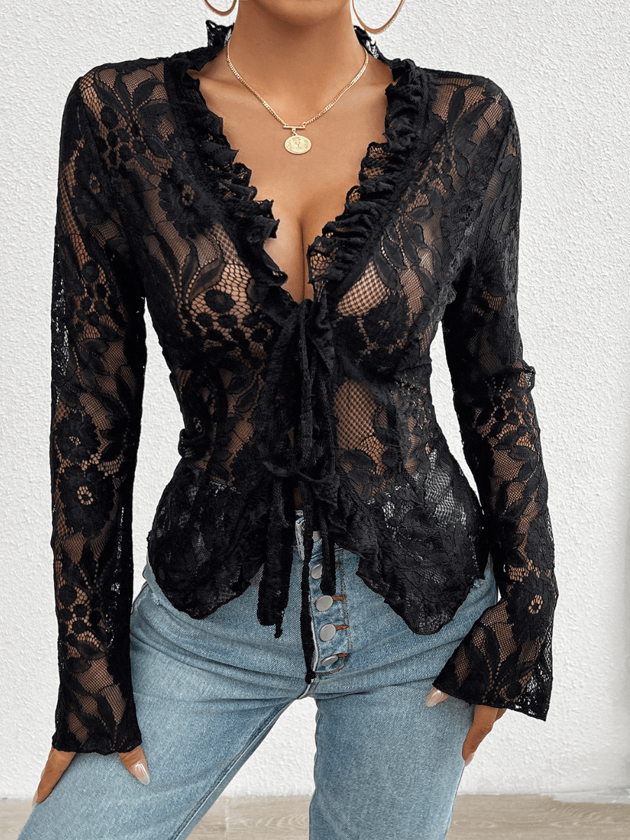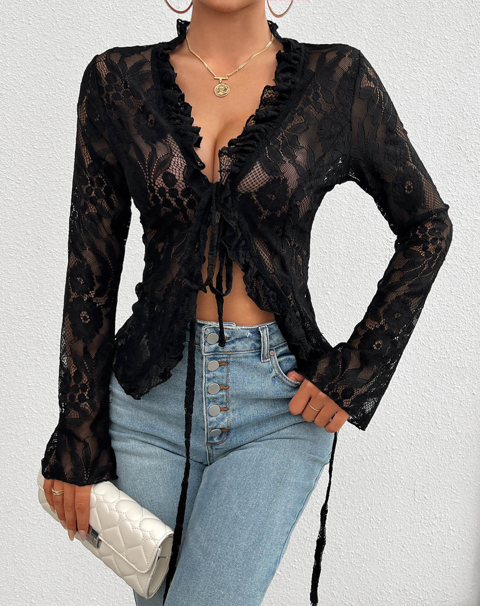Add a touch of whimsy to your wardrobe with our Janelle Floral Lace Sheer Cardigan in classic black. Featuring delicate lace and a sheer design, this cardigan is perfect for layering or wearing on its own. Bring some fun and femininity to any outfit with this playful piece.