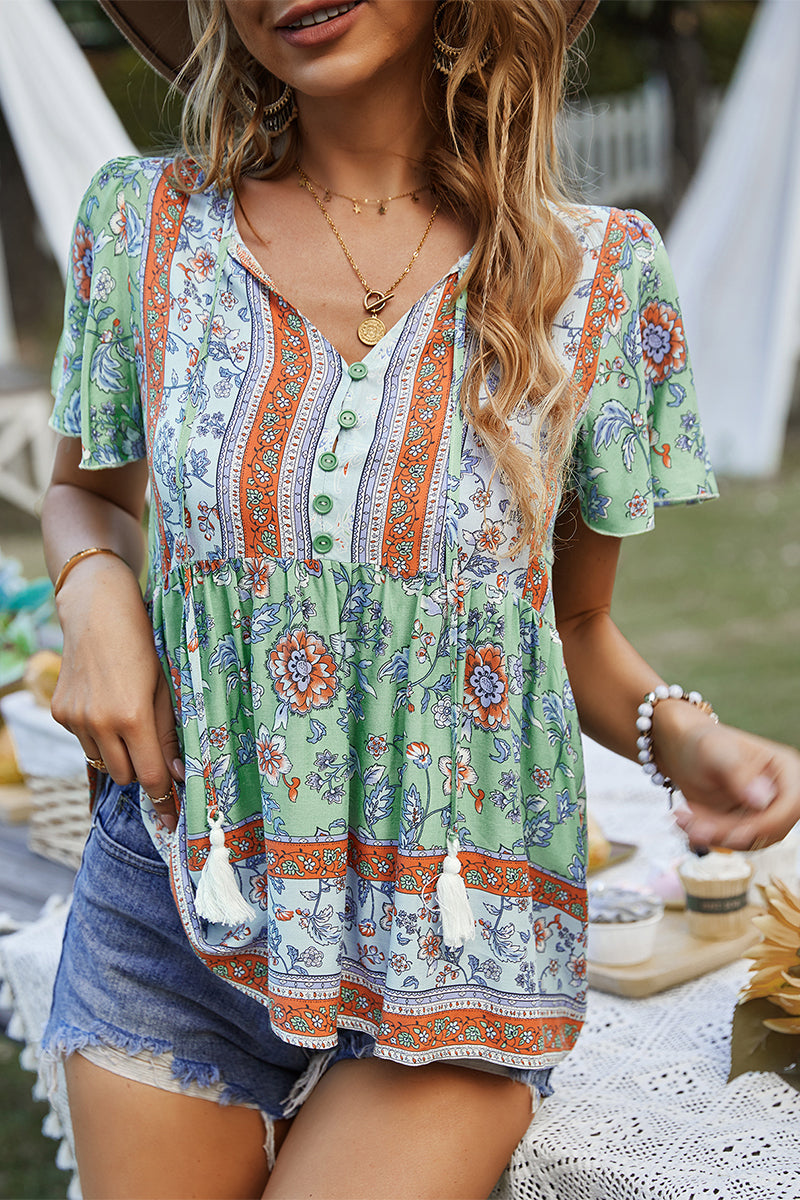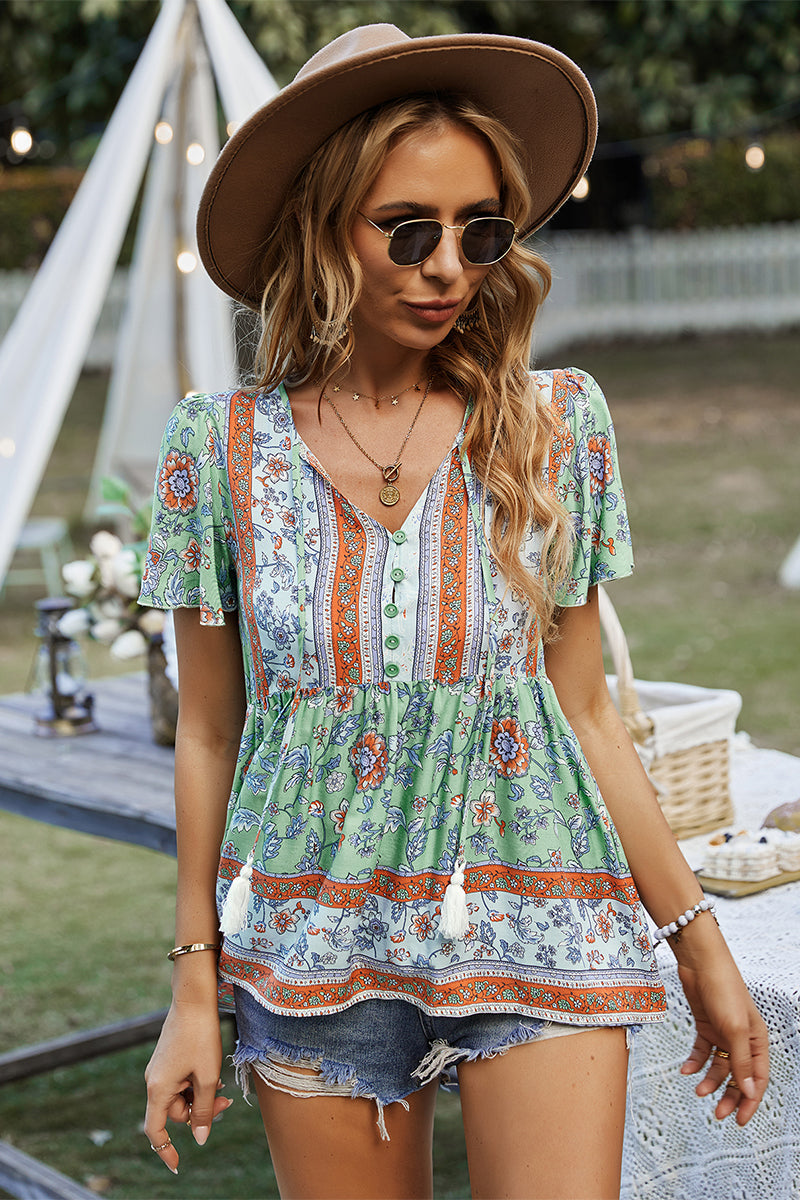 Our Jen Top is alightgreen base with orange &blue tone floral print. It features a v neckline and short sleeves for a relaxed, comfortable fit. This top pairs beautifully with basic pants for a fun casual look!
