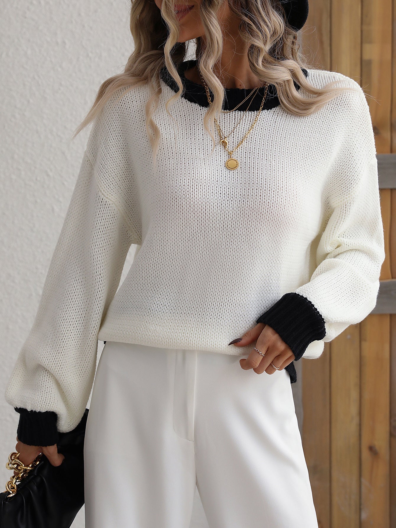 Our Kasmere knit sweater comes in an elegant cream base withblack contrast cuff. Your go-to chilling buddy while relaxing in the aroma of scented candles in a romantic ambience, thissweater is designed with aclassic crew collar, long relaxed drop sleeves. Match it withour luxe ankle bootsor trendyleather boots!