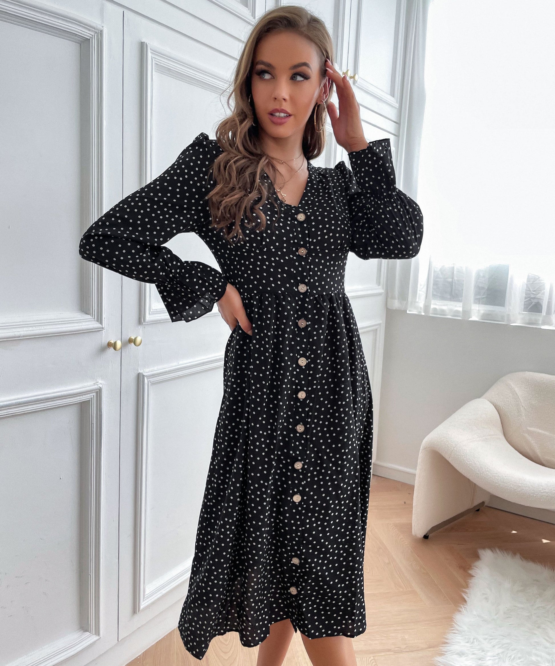 Our Korba SpotDress is asolid black tone. Perfect forspring. This breathable number features a v neckline with buttons on front making this not only feminine & flirty but ideal for maternity wear. The midi length is a conservative feature you're sure to appreciate on windy days. The frill detail on the sleeves is a cute addition. Pair with our fave strappy sandals for a great picnic or beach outfit.