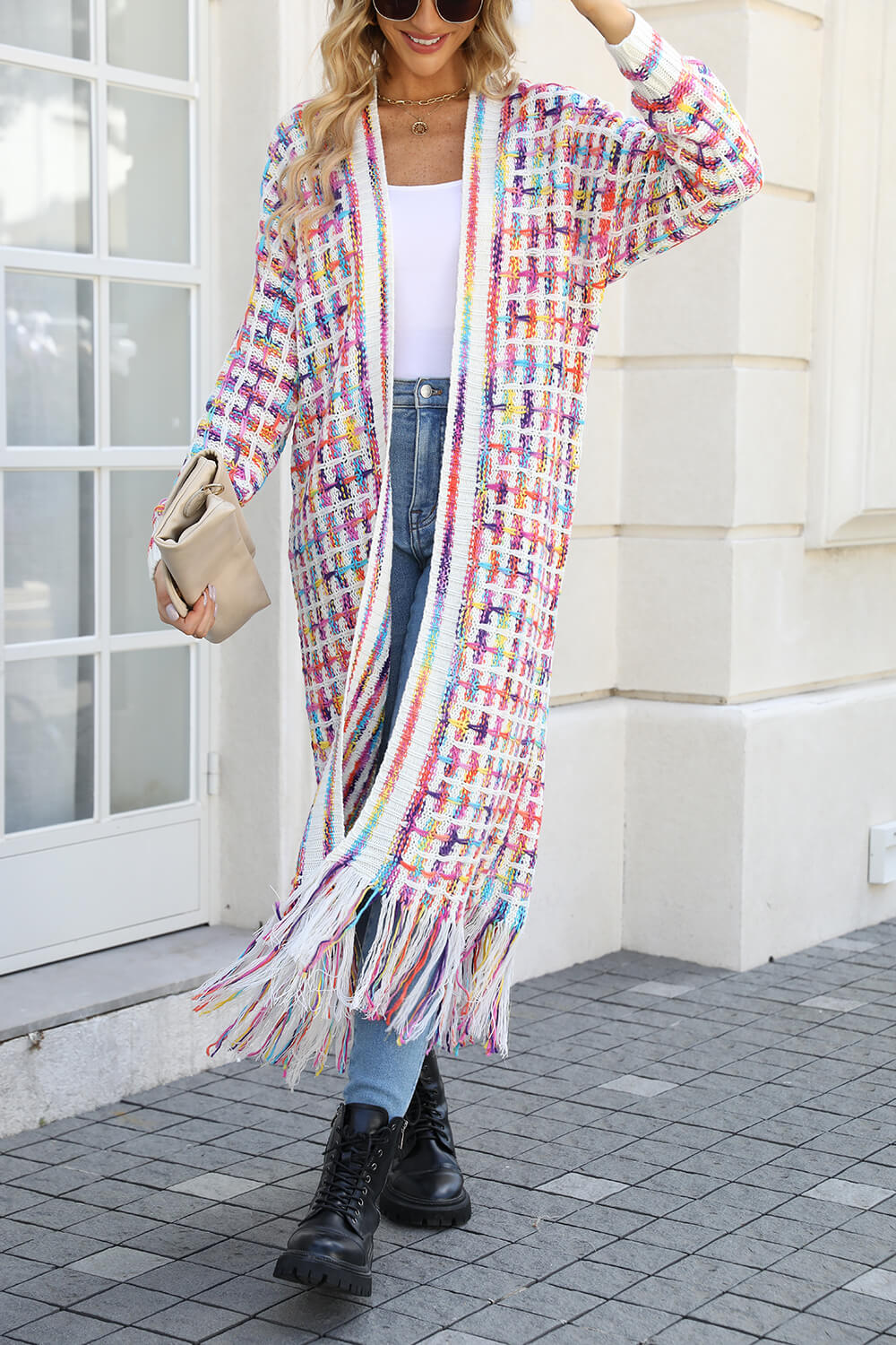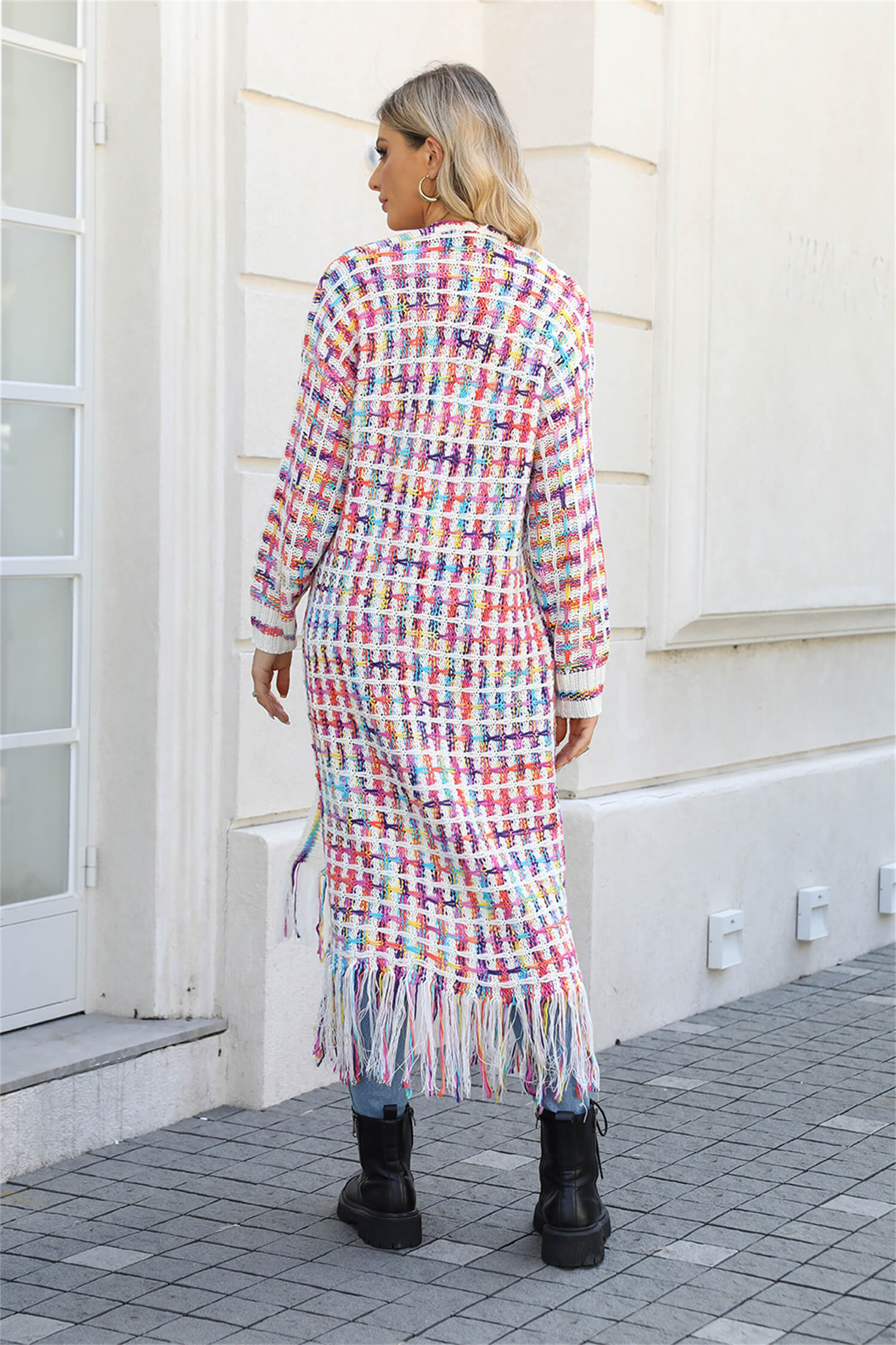 - Key Features:Long Sleeves. Open Front no closures. Fringe Tassel Hem. Lightweight Soft & CrochetFabric with Stretch. Relaxed fit. Maternity Friendly.