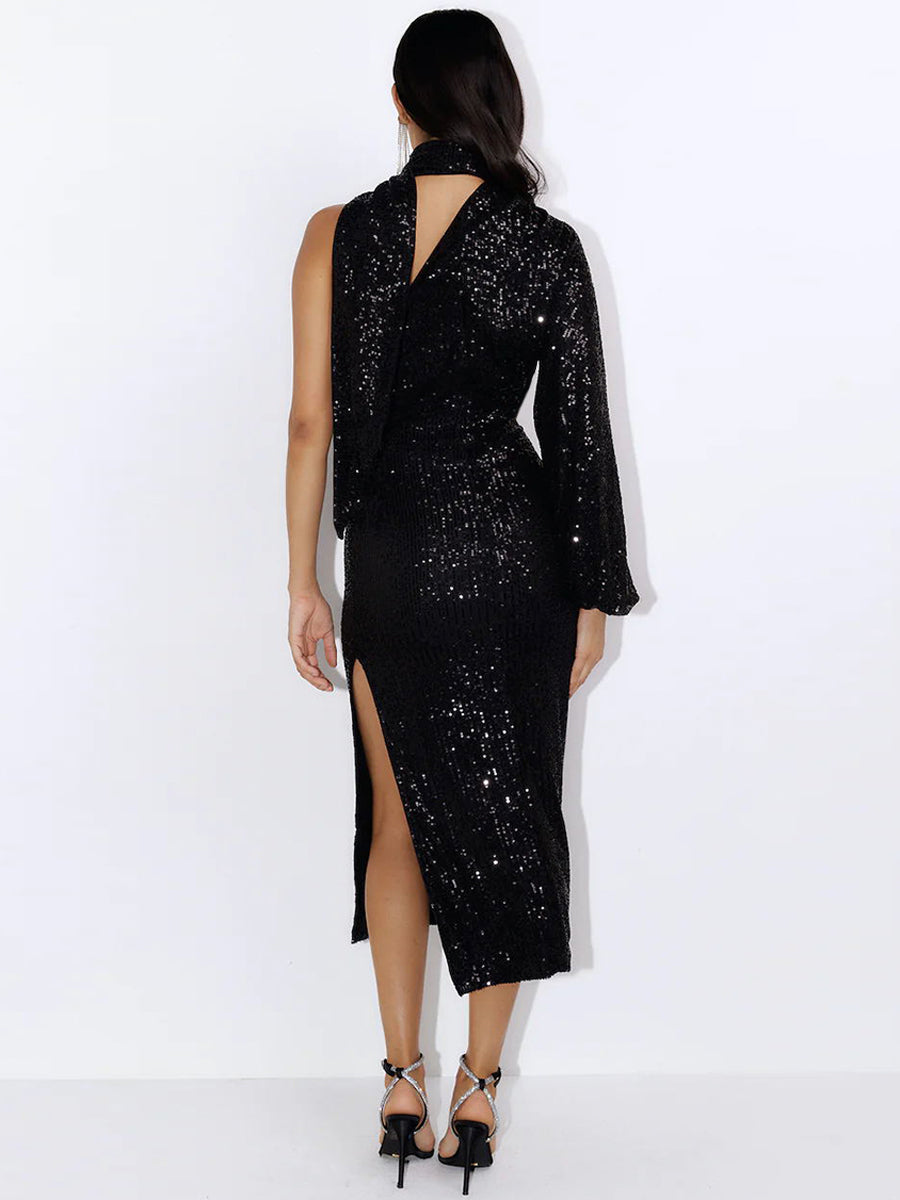 Elevate your evening wardrobe with this stunning Layton Sequin One-Shoulder Midi Dress. Delicately crafted from a luxe blend of sequin and crepe fabric, this contemporary silhouette features an of-the-moment asymmetric one-shoulder halter neckline and cascading ruching, allowing you to make a sophisticatedly chic style statement.