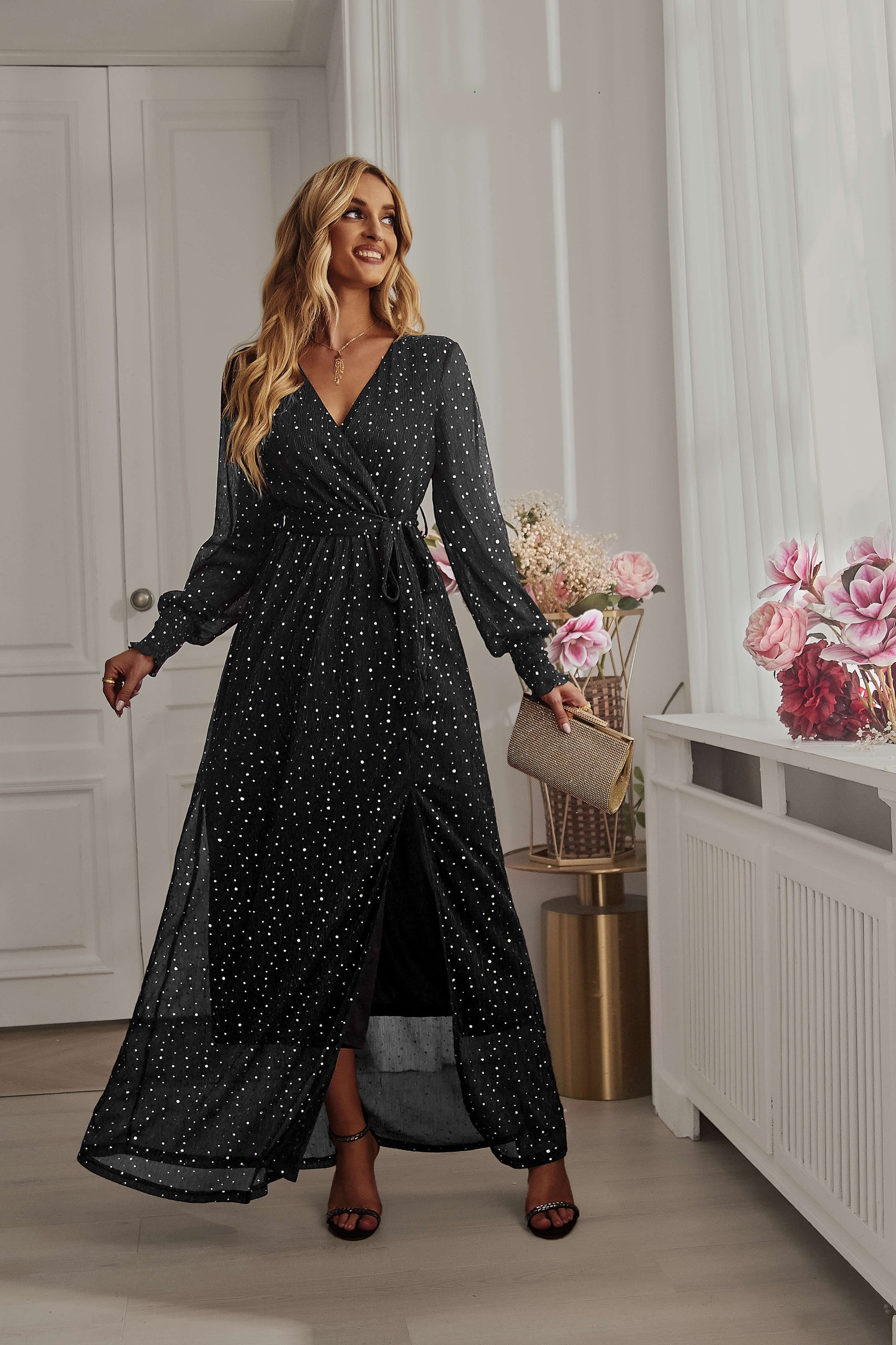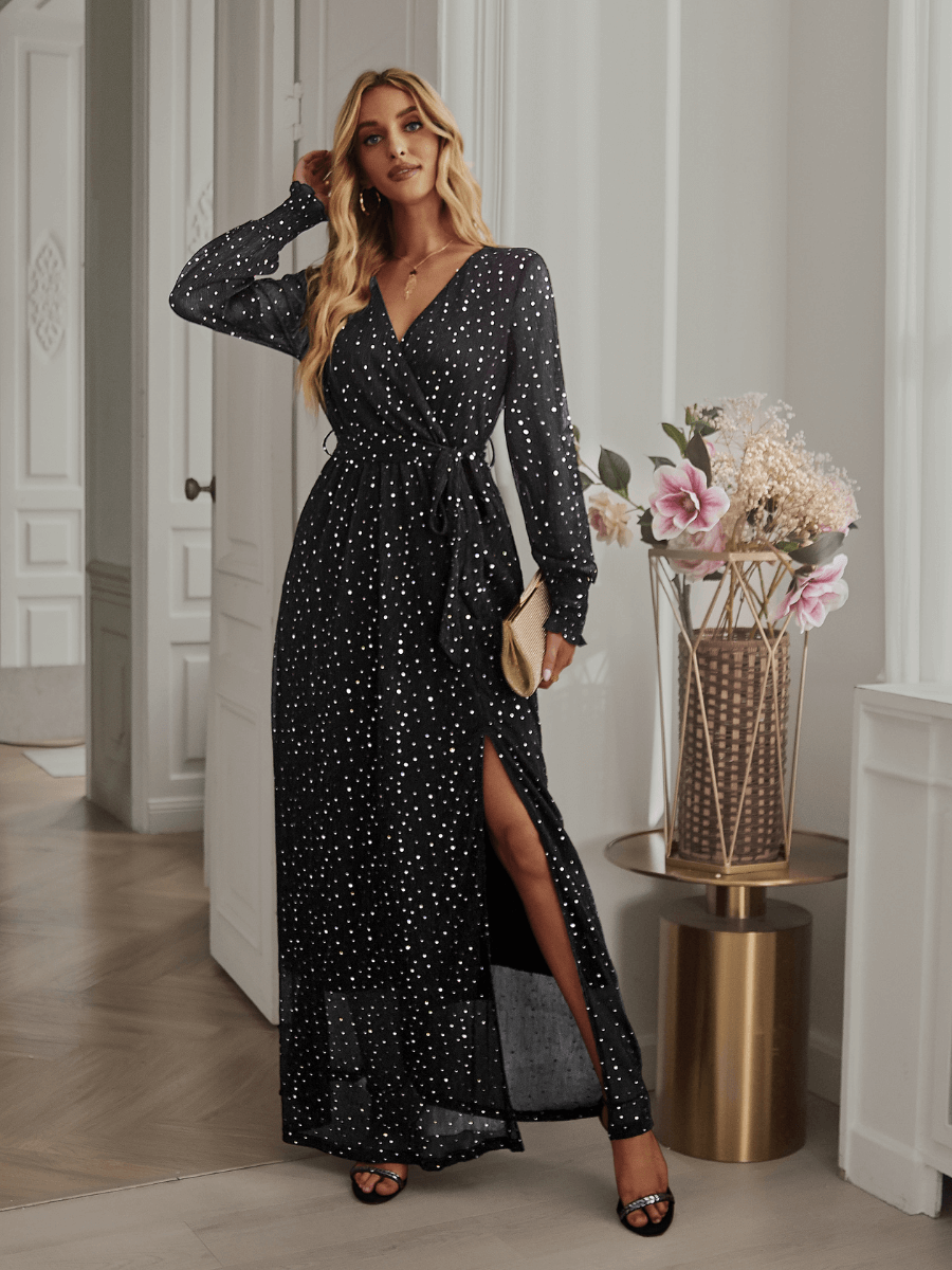 LEANDRA FRONT SPLIT SHIMMER MAXI DRESS - BLACK