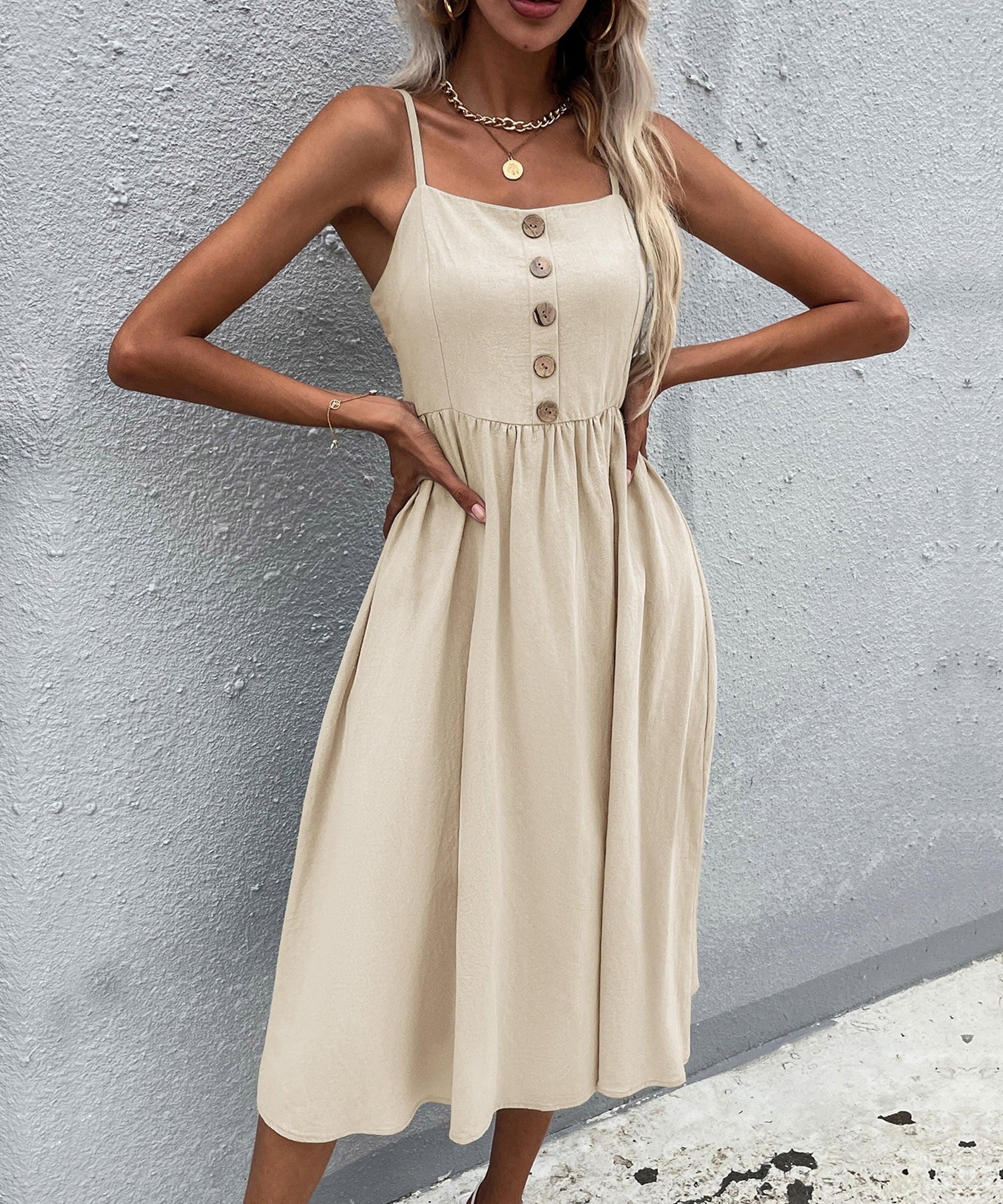 Our Lindsay Dress comes in a classic neutralbeige in a relaxed fit. This summer must-have features a straight neckline with adjustable shoulder straps and decorative buttons down the front. This piece is perfect for throwing on for a comfortable and effortless casual spring and summer look.