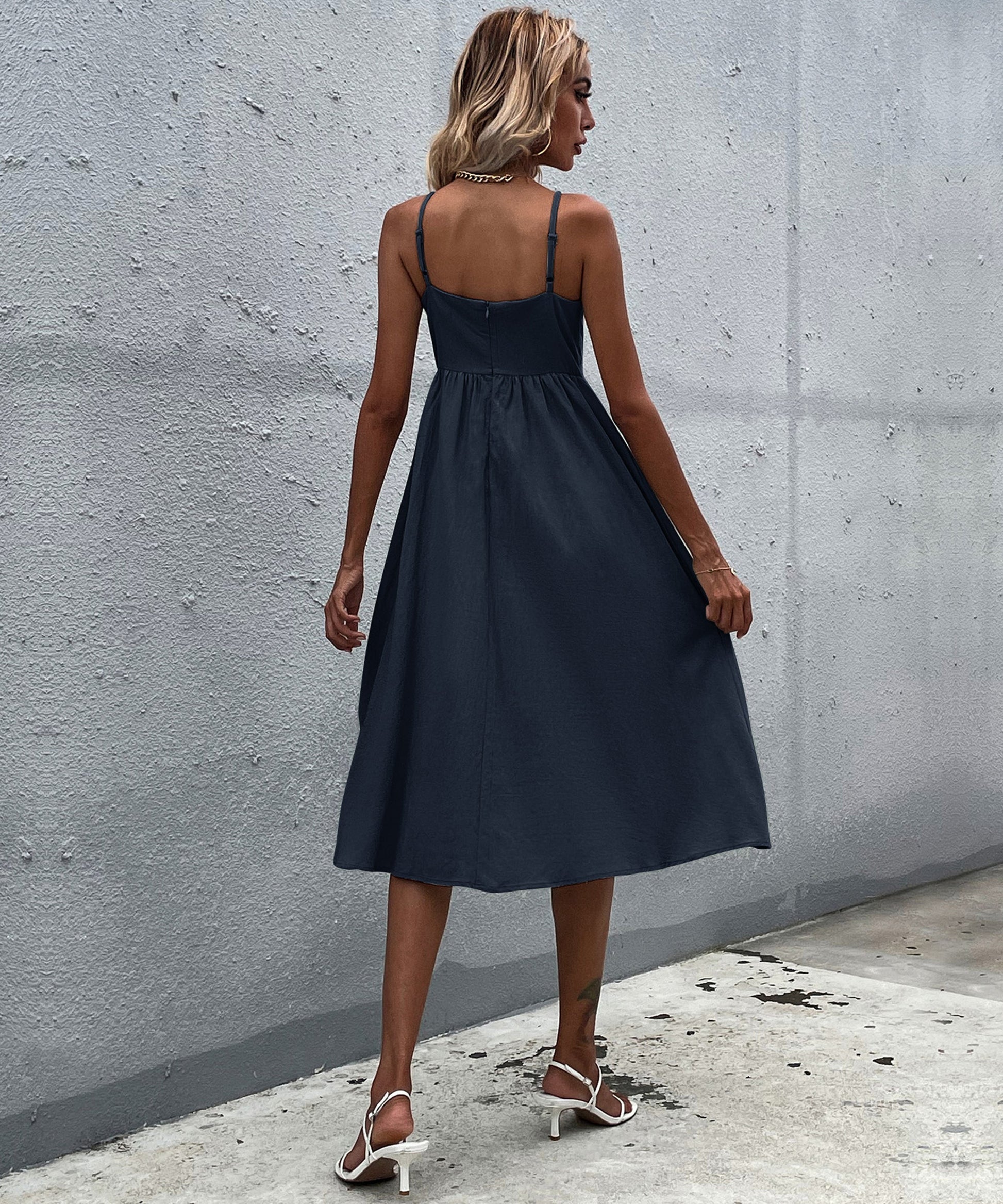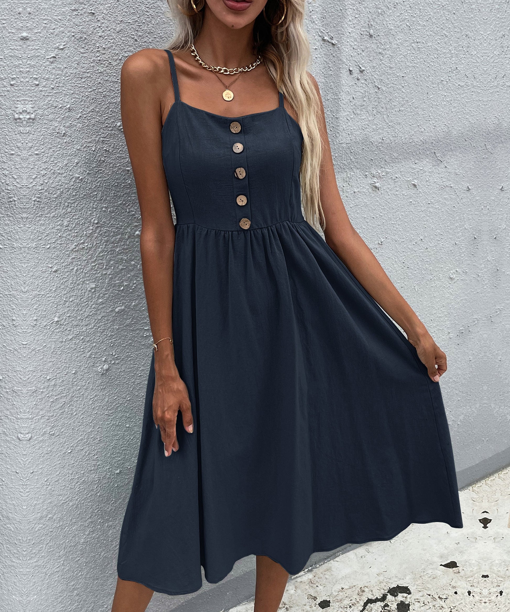 Our Lindsay Dress comes in anavy tone in a relaxed fit. This summer must-have features a straight neckline with adjustable shoulder straps and decorative buttons down the front. This piece is perfect for throwing on for a comfortable and effortless casual spring and summer look.