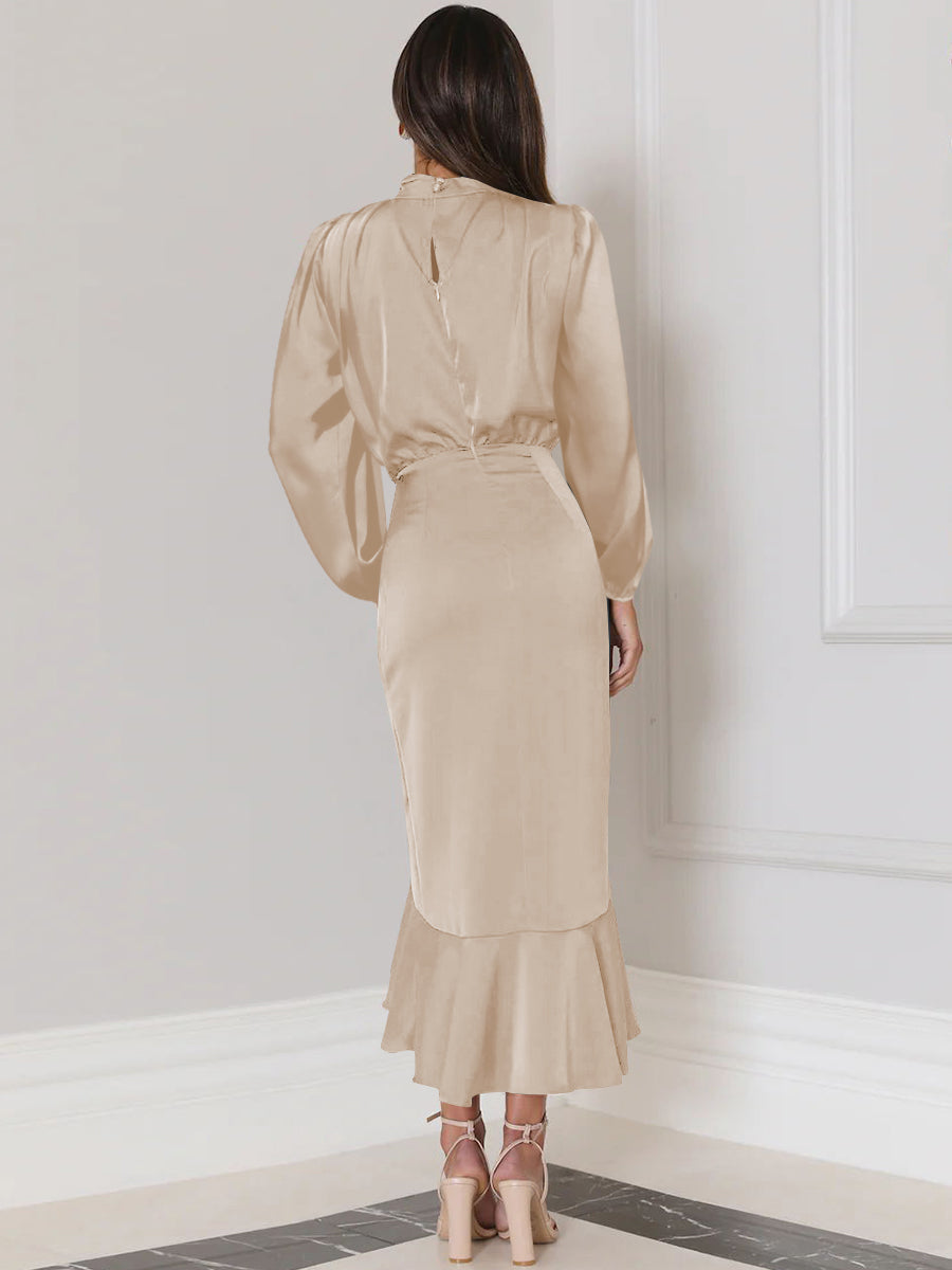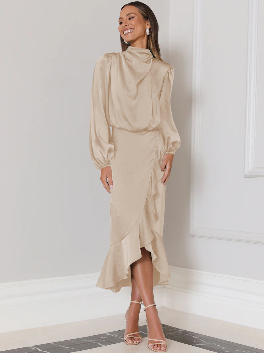 - Feature:HighNeckline. Long Sleeve. High-Low Ruffle Hemline.Midi Length. Satin Fabrication. Black Zipper & Button Closure.