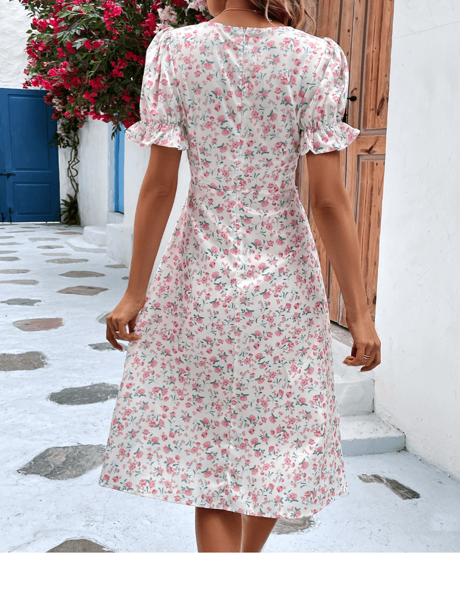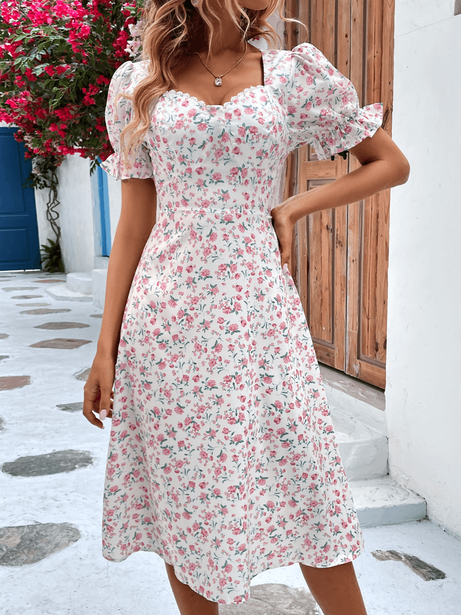 - Feature: Mini Length. Square Heart neckline. Floral print. Short sleeves.
