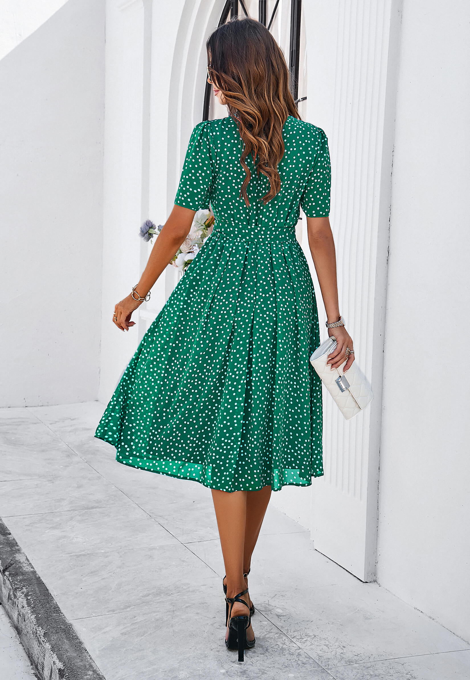 - Feature: High Scoop Neckline. Short Sleeves. Tie Waist Belt. Polka. Lined. Midi length.