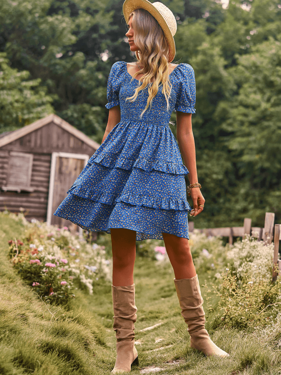 - Feature:Heart neckline. Mini length. Off-shoulder wearable. Smocked bodice. Short Sleeves. Ruffle Layer Skirt.