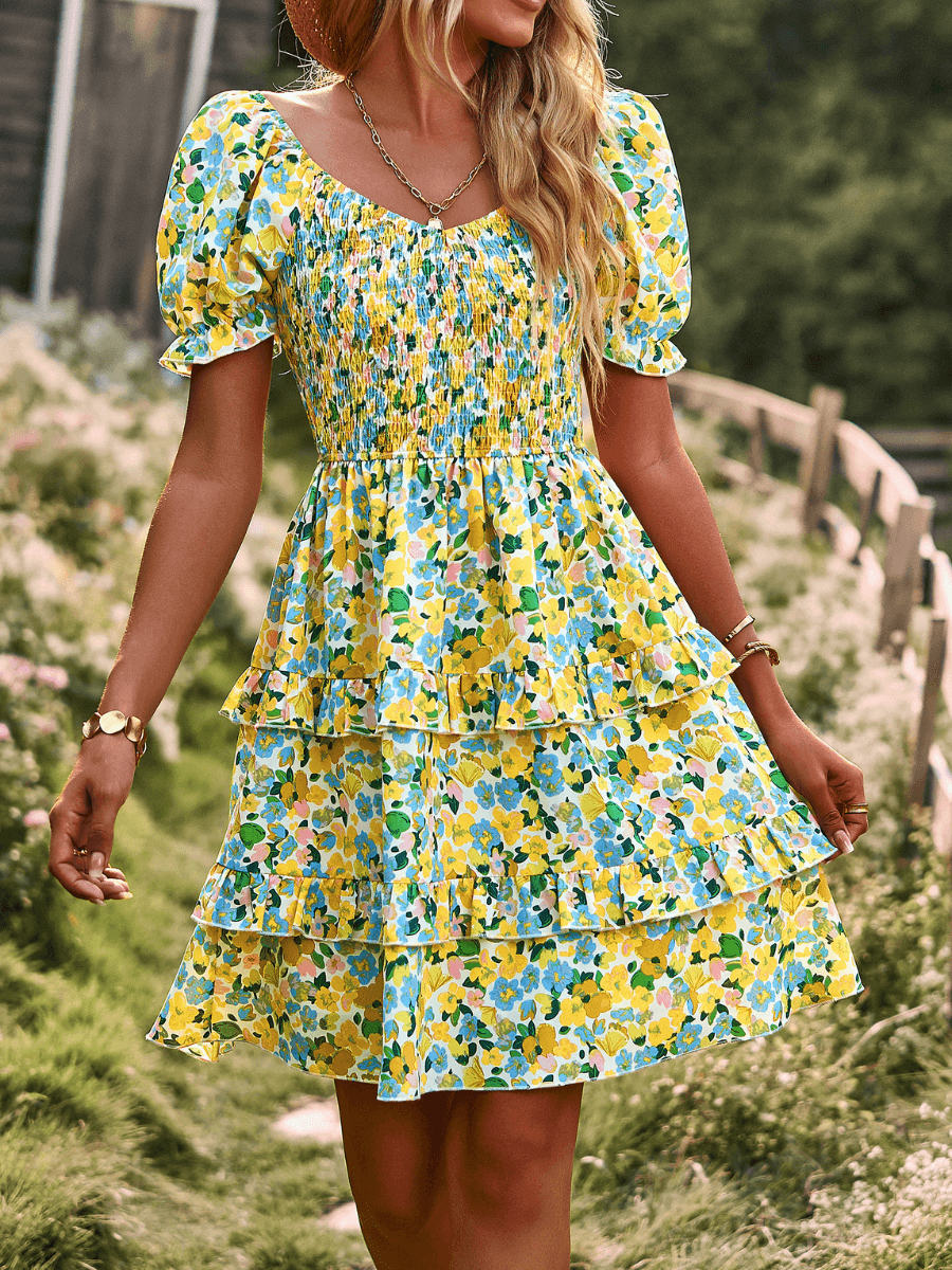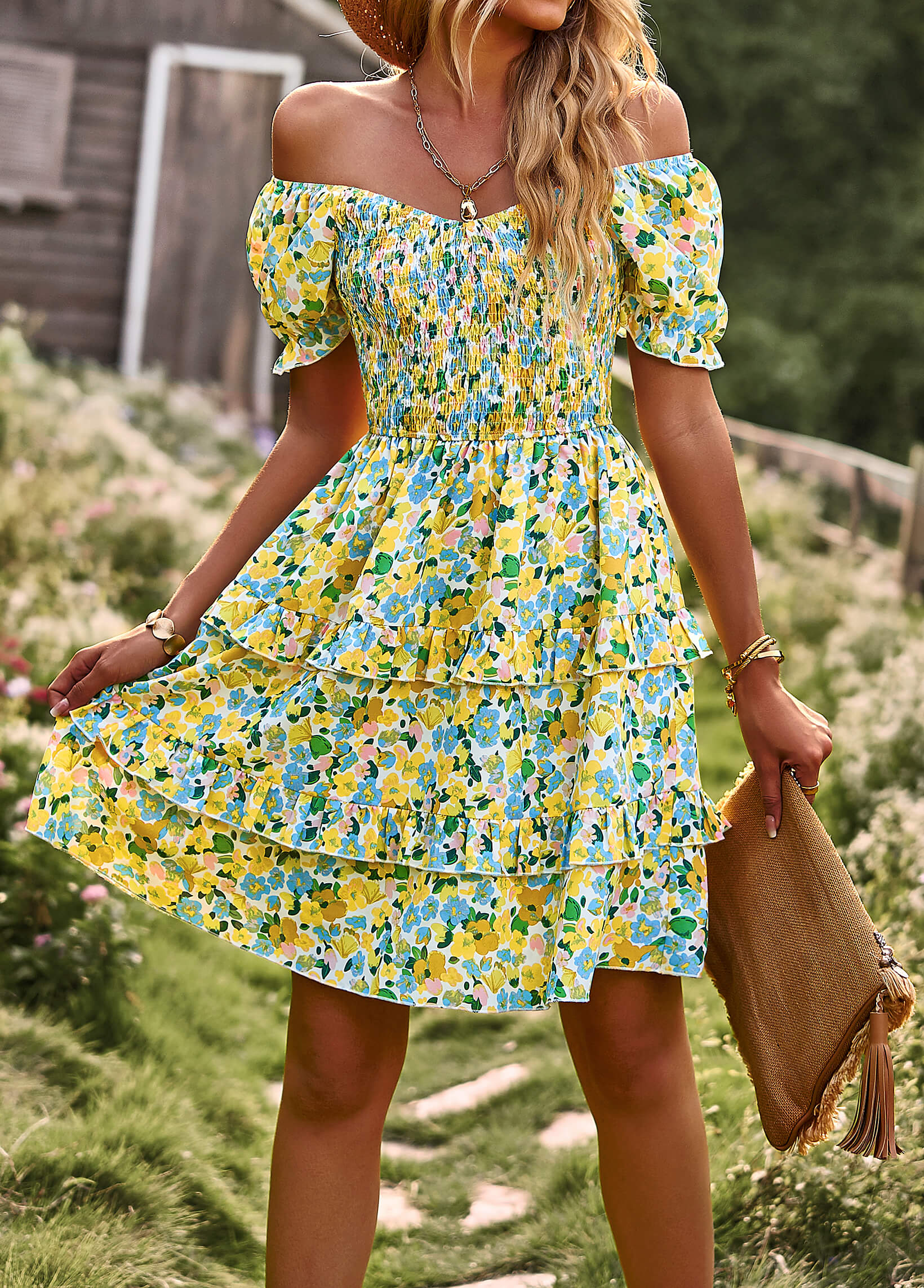 - Feature:Heart neckline. Mini length. Off-shoulder wearable. Smocked bodice. Short Sleeves. Ruffle Layer Skirt.