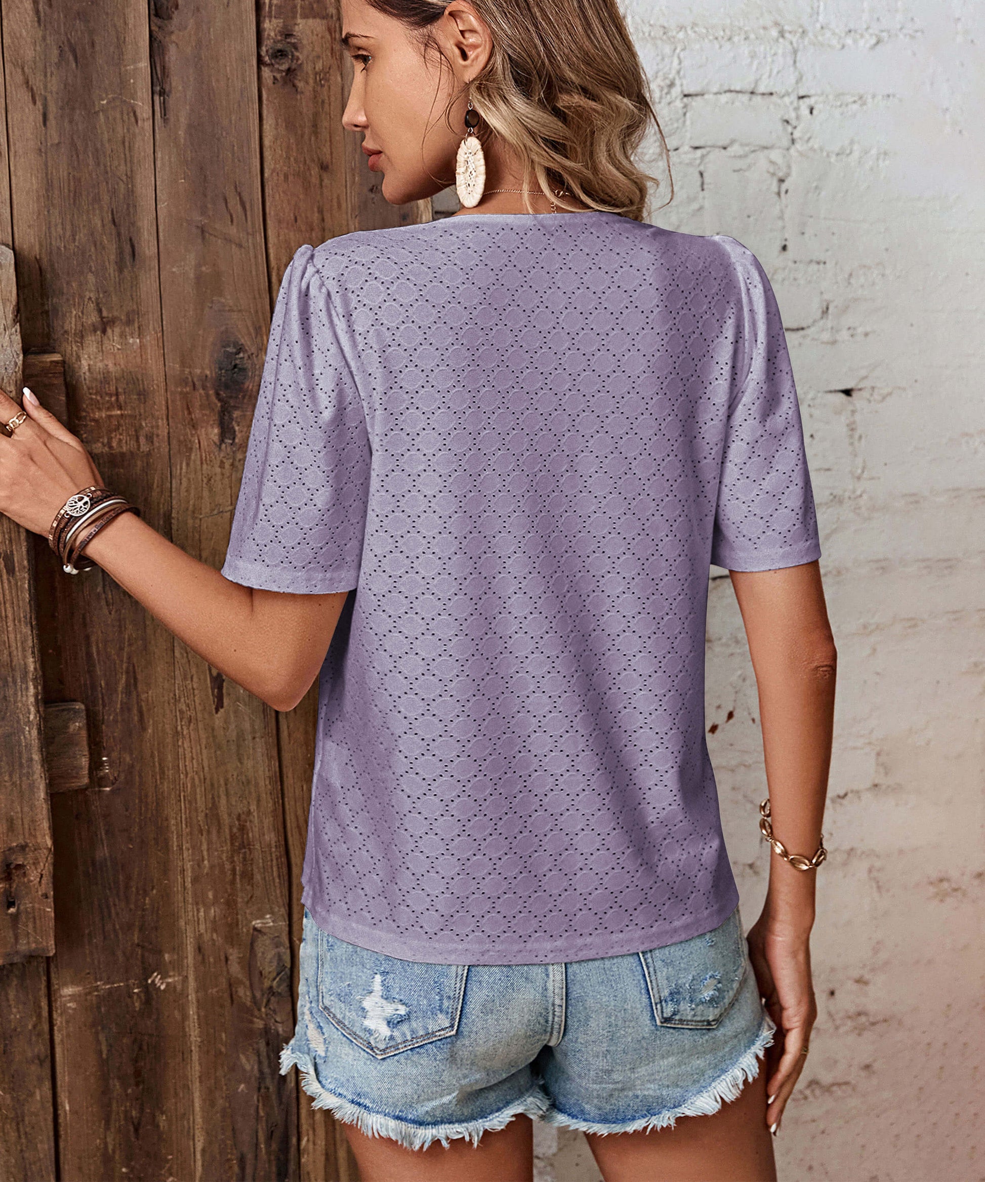 - Feature: V-neckline. Short sleeves. Eyelet detail. Not lined. Lightweight Fabric. Relaxed fit.