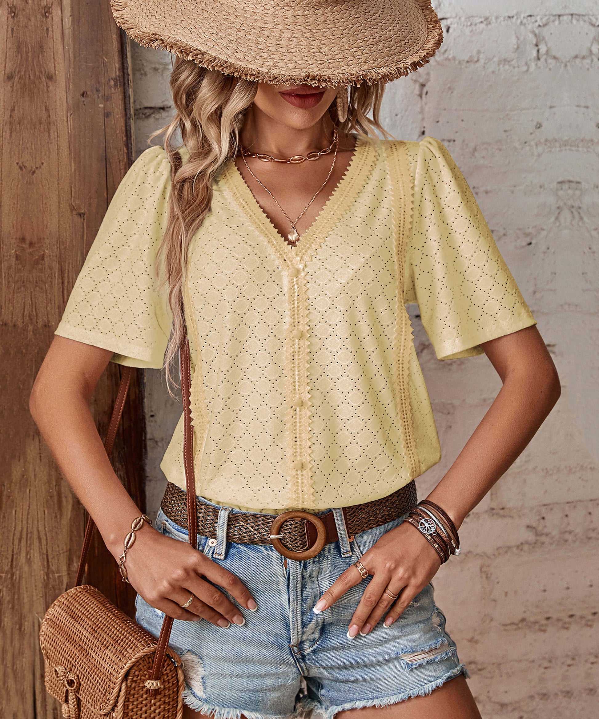 - Feature: V-neckline. Short sleeves. Eyelet detail. Not lined. Lightweight Fabric. Relaxed fit.