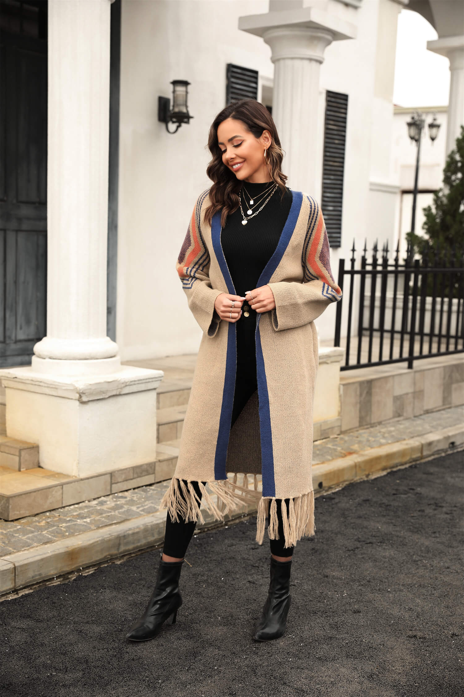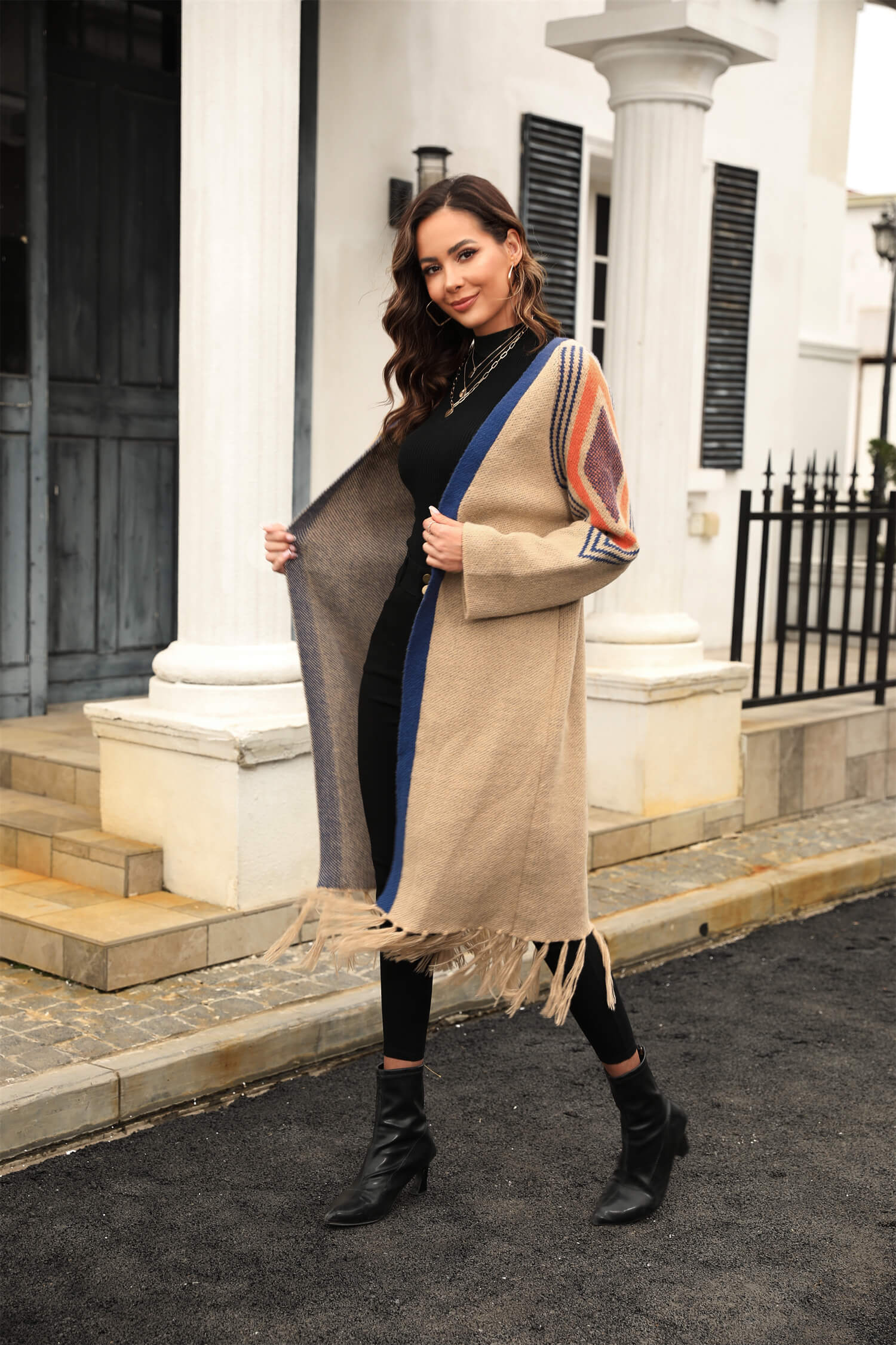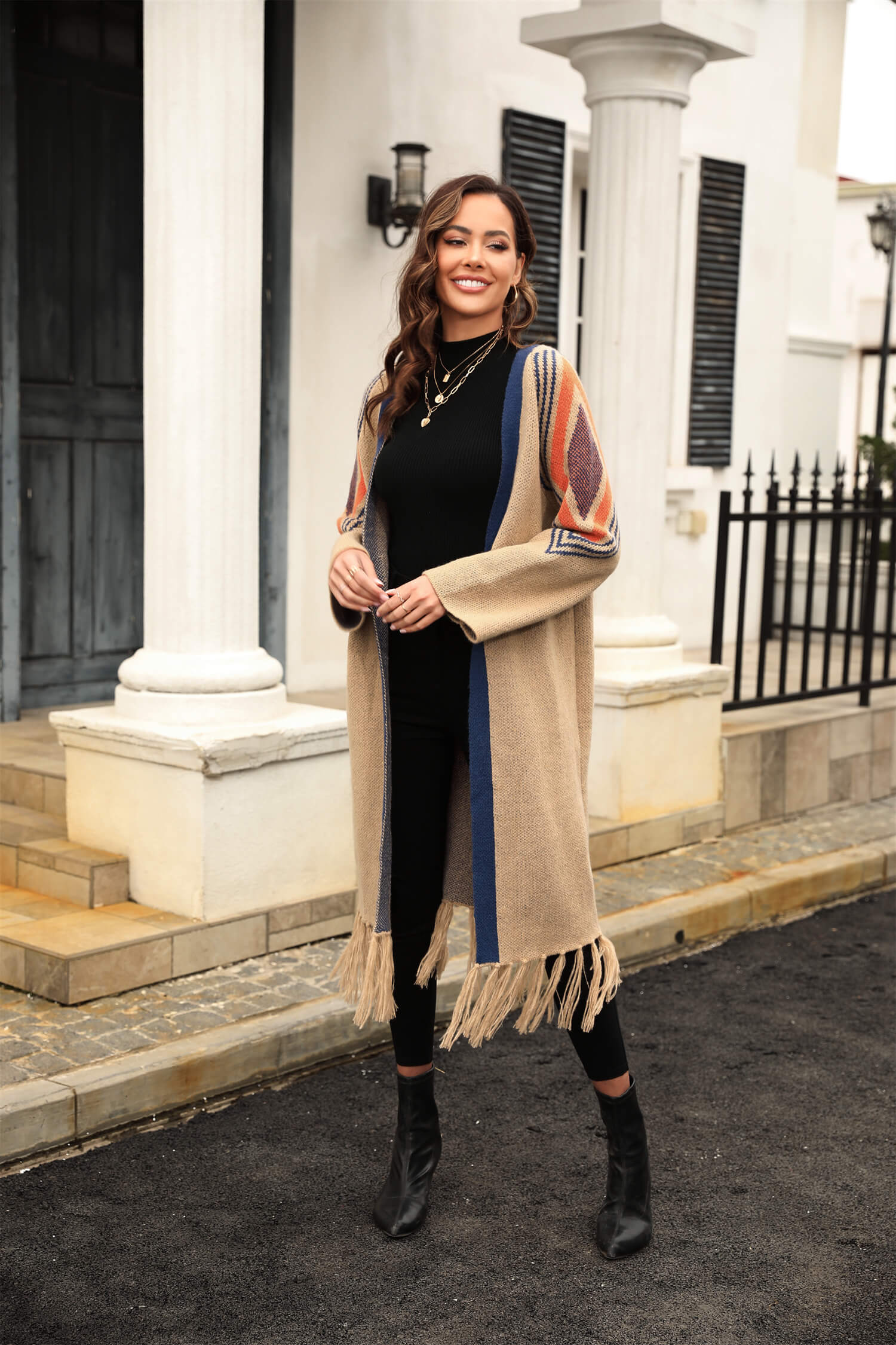 - Key Features:Long Sleeves. Open Front. Fringe Tassel Hem. Midweight Soft & Gauzy Fabric with Stretch.No Closures. Relaxed fit.