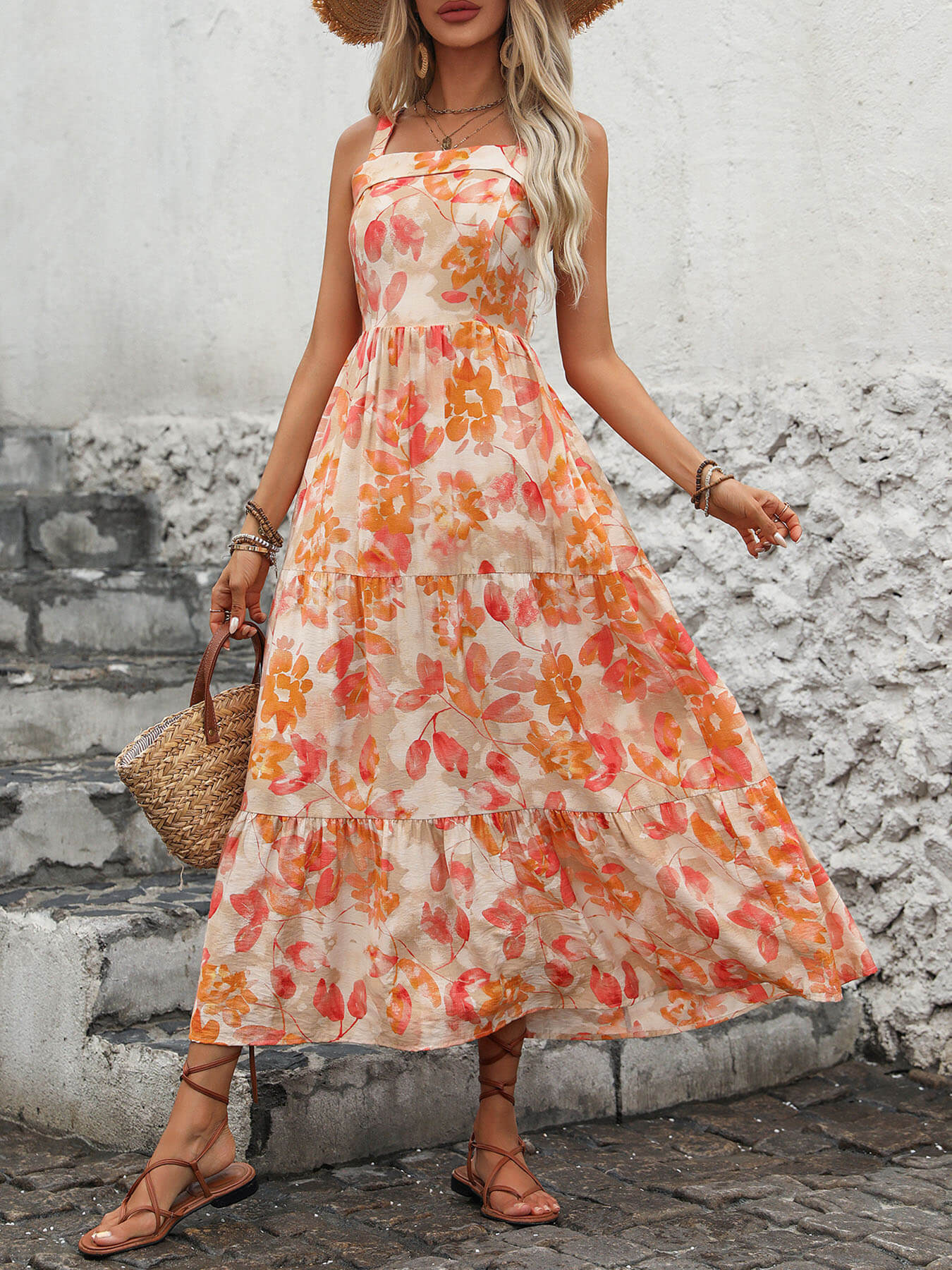 - Feature: Square neckline. Sleeveless. Tiered Style. Tropical floral pattern. Open Cross bar back. Midi length. Relaxed fit.