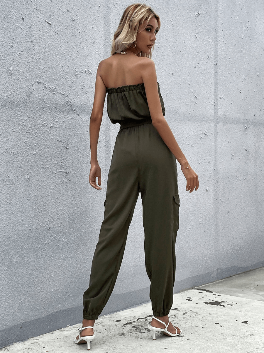 - Feature: Strapless neckline. Cargo jogger leg. Drawstring waist. Side pockets. No closure. Not lined.