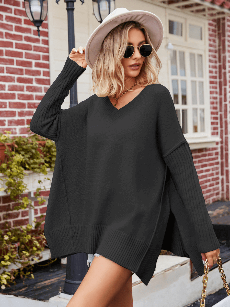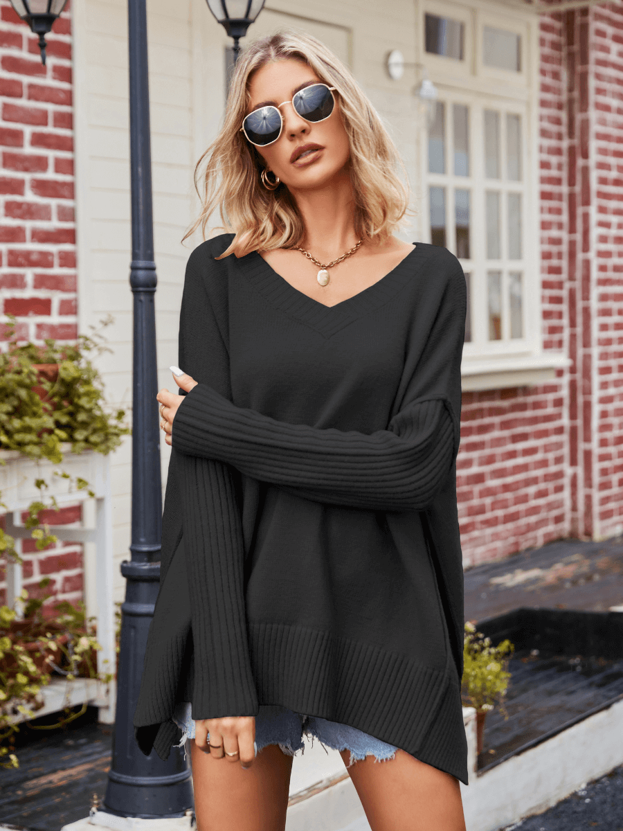 - Feature: V-neckline. Drop shoulders. Long Sleeves. Side slits. Soft Knit Fabric. Ribbed Edges. Oversized relaxed Fit. Maternity friendly.